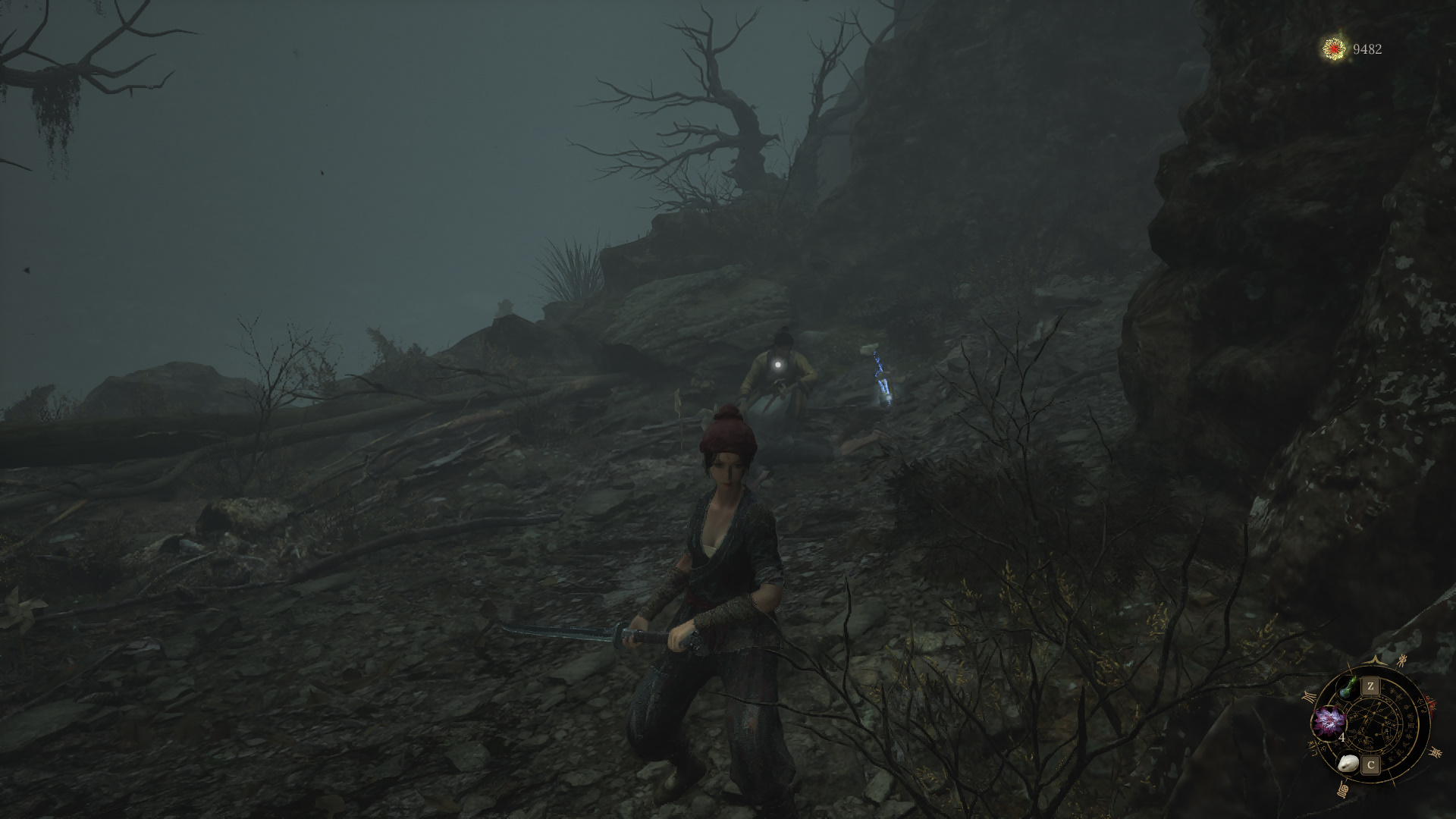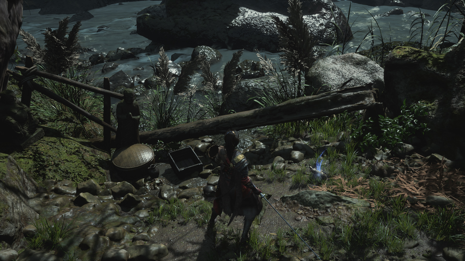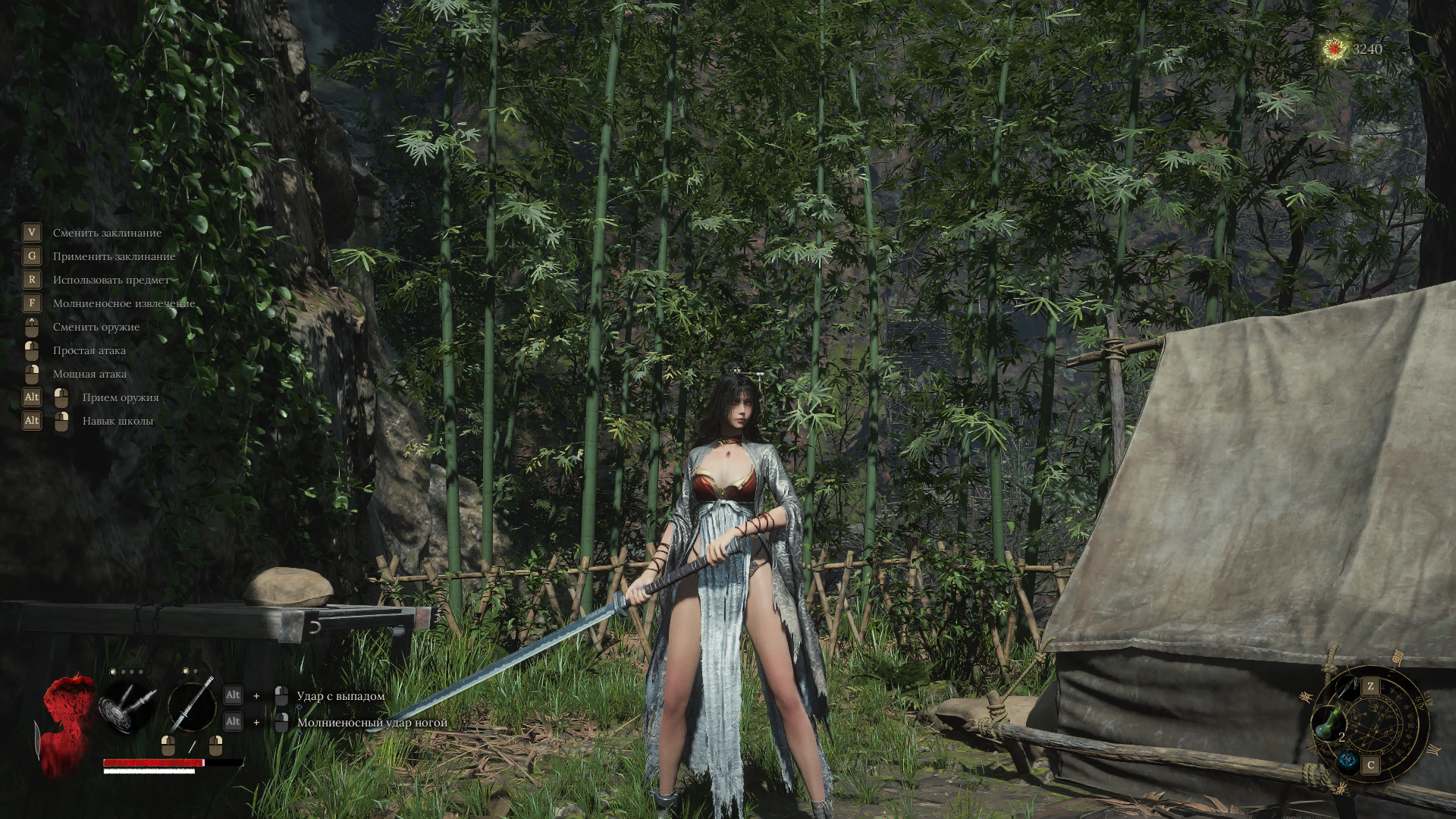 После вступительный сцена развернитесь и подберите побег Красной ртути. Красная ртуть — аналог душ из серии Dark Souls, используется для повышения шести основных характеристик Учан. Можете использовать предмет в инвентаре, чтобы получить 100 единиц красной ртути. Выйдите из пещеры, чтобы увидеть кат-сцену с незнакомкой и получить свое первое оружие — длинный меч «Первый снег» (при успешном парировании снижает получаемый урон).