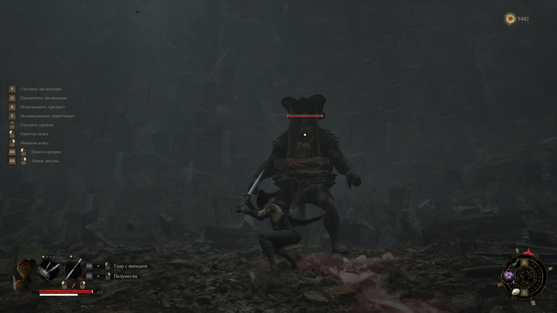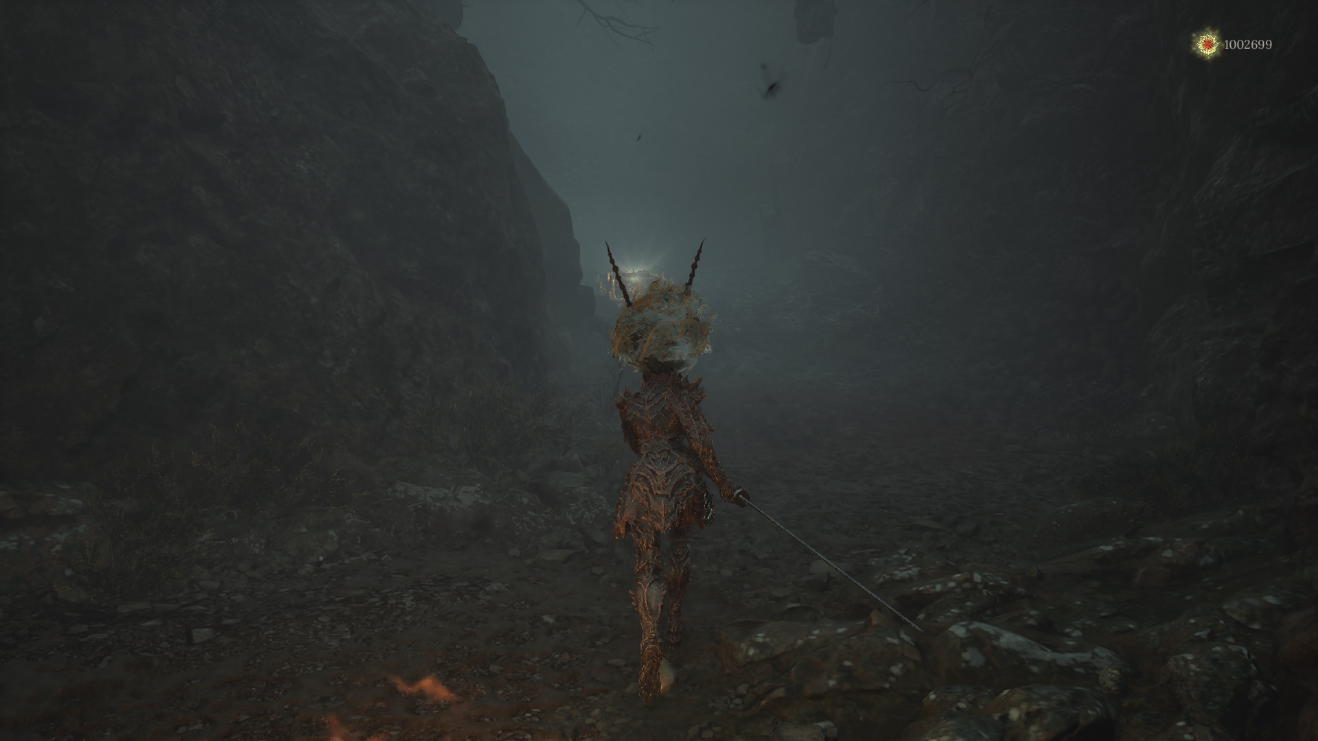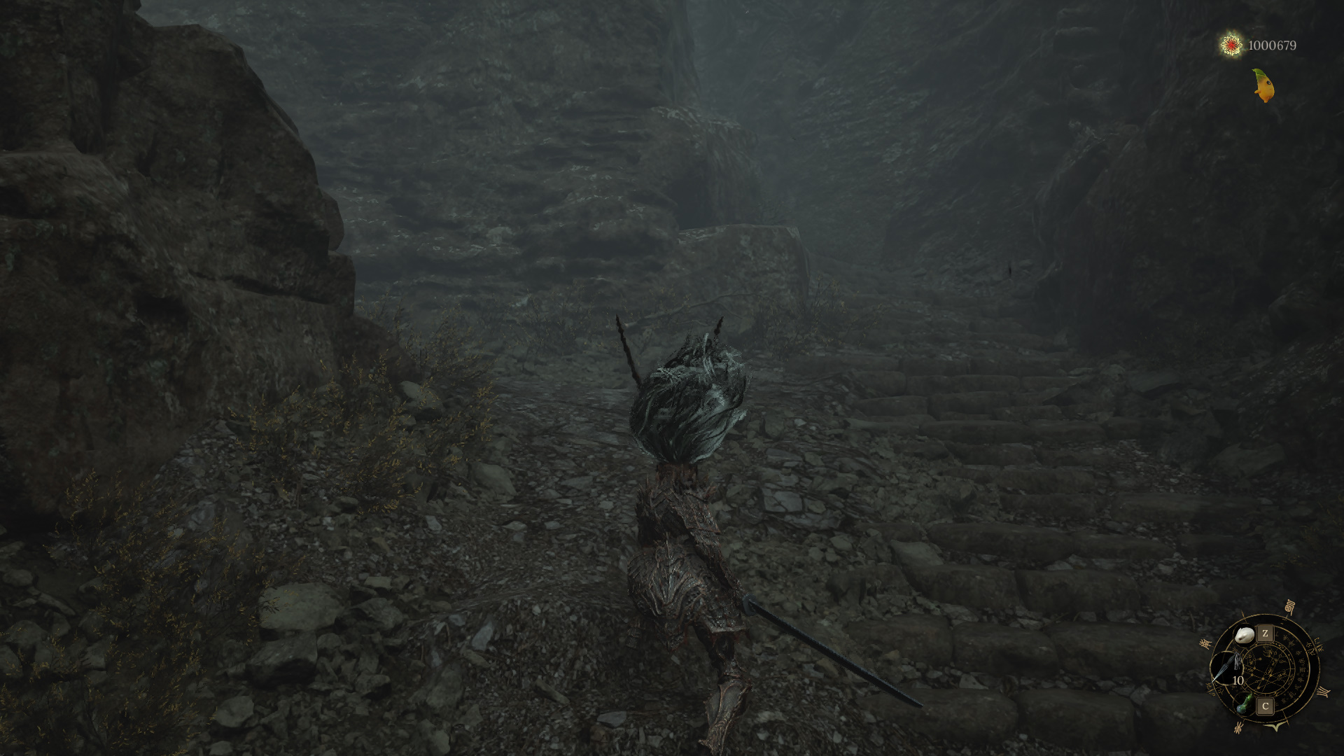 После вступительный сцена развернитесь и подберите побег Красной ртути. Красная ртуть — аналог душ из серии Dark Souls, используется для повышения шести основных характеристик Учан. Можете использовать предмет в инвентаре, чтобы получить 100 единиц красной ртути. Выйдите из пещеры, чтобы увидеть кат-сцену с незнакомкой и получить свое первое оружие — длинный меч «Первый снег» (при успешном парировании снижает получаемый урон).
