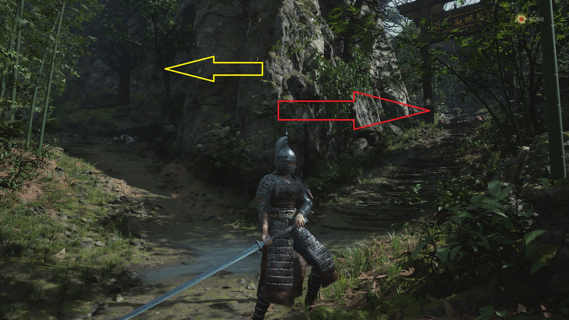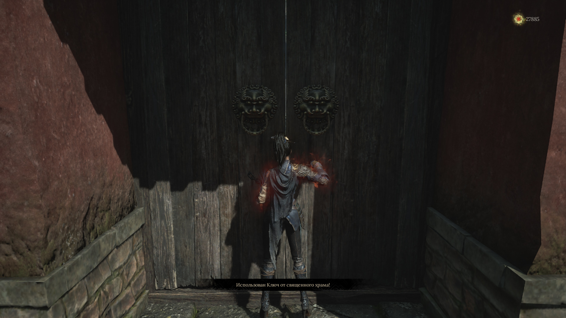 Покиньте Бамбуковый дворик и сверните влево, чтобы покинуть Небесную деревню. Сверните на развилке влево, спуститесь к монаху, пожирающему плоть. В конце пути будут ворота, которые вы сможете открыть, чтобы вернуться во двор у Священного храма.