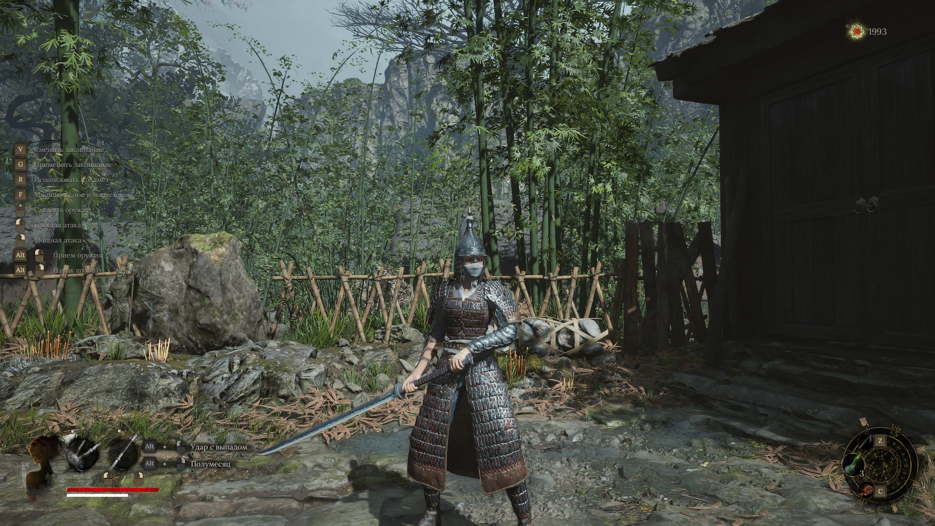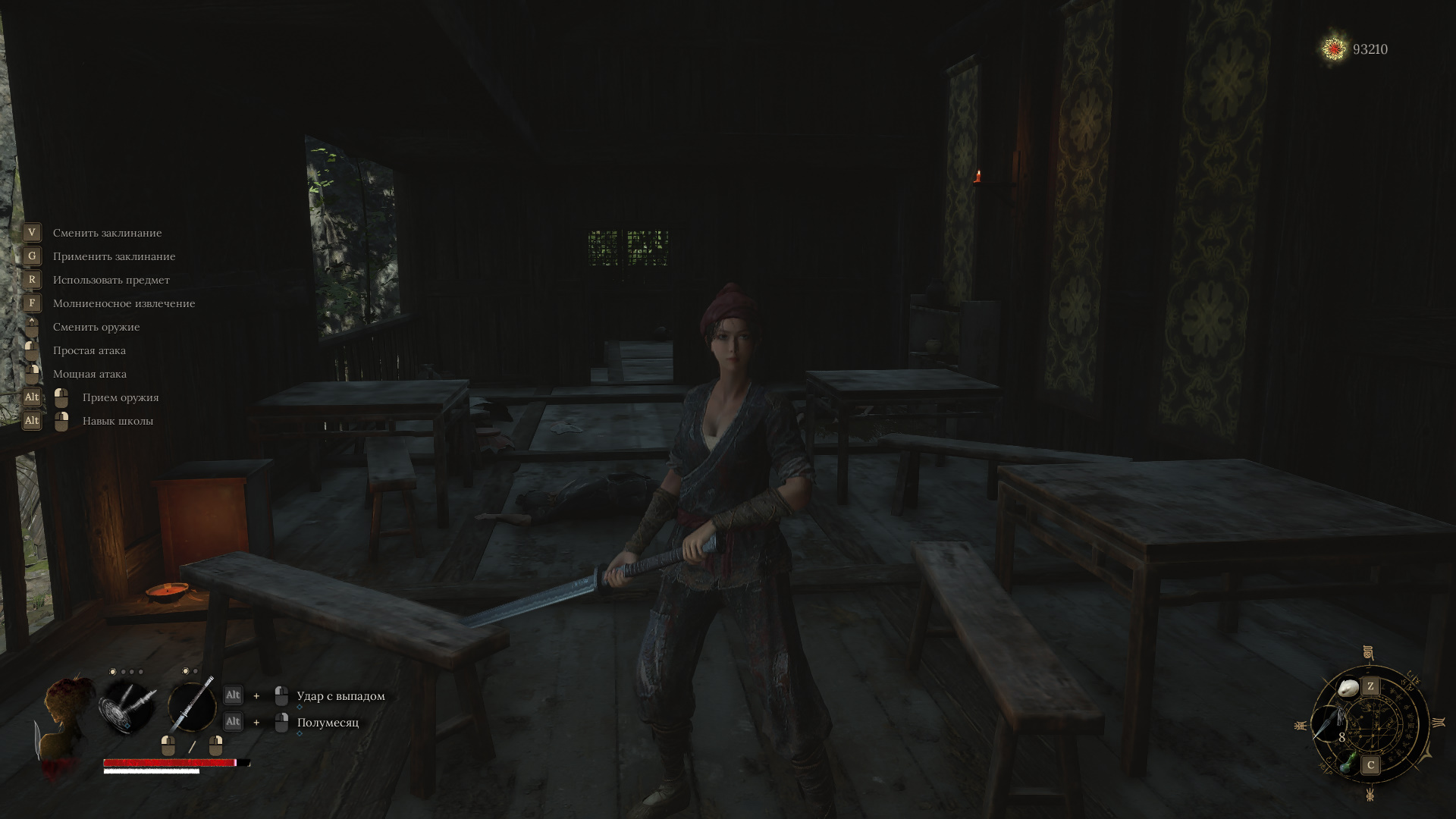 В зданиях слева ищите новый нефритовый кулон — кулон обезьяны (повышает силу метательных снарядов). На столе, где сидели враги у бочек, лежит новое оружие — одноручный меч «Темный лед».