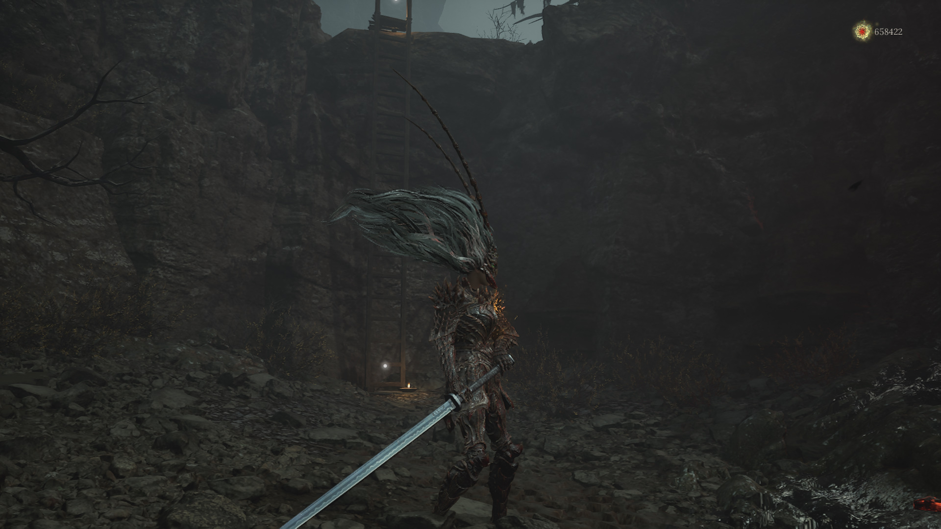 Слева от Дамы в красном есть выступ: если спрыгните, вернетесь на основную тропу неподалеку от святилища «Зловонный берег ив». Путь справа ведет вниз по склону, на локацию в обход огненного барьера, увиденного ранее. Спустившись, можете пойти вправо, чтобы найти в тупике добычу. Идите вперед, сверните влево и обнаружите сундук. Внутри него спрятаны Забытые воспоминания, увеличивающие количество зелий маны.