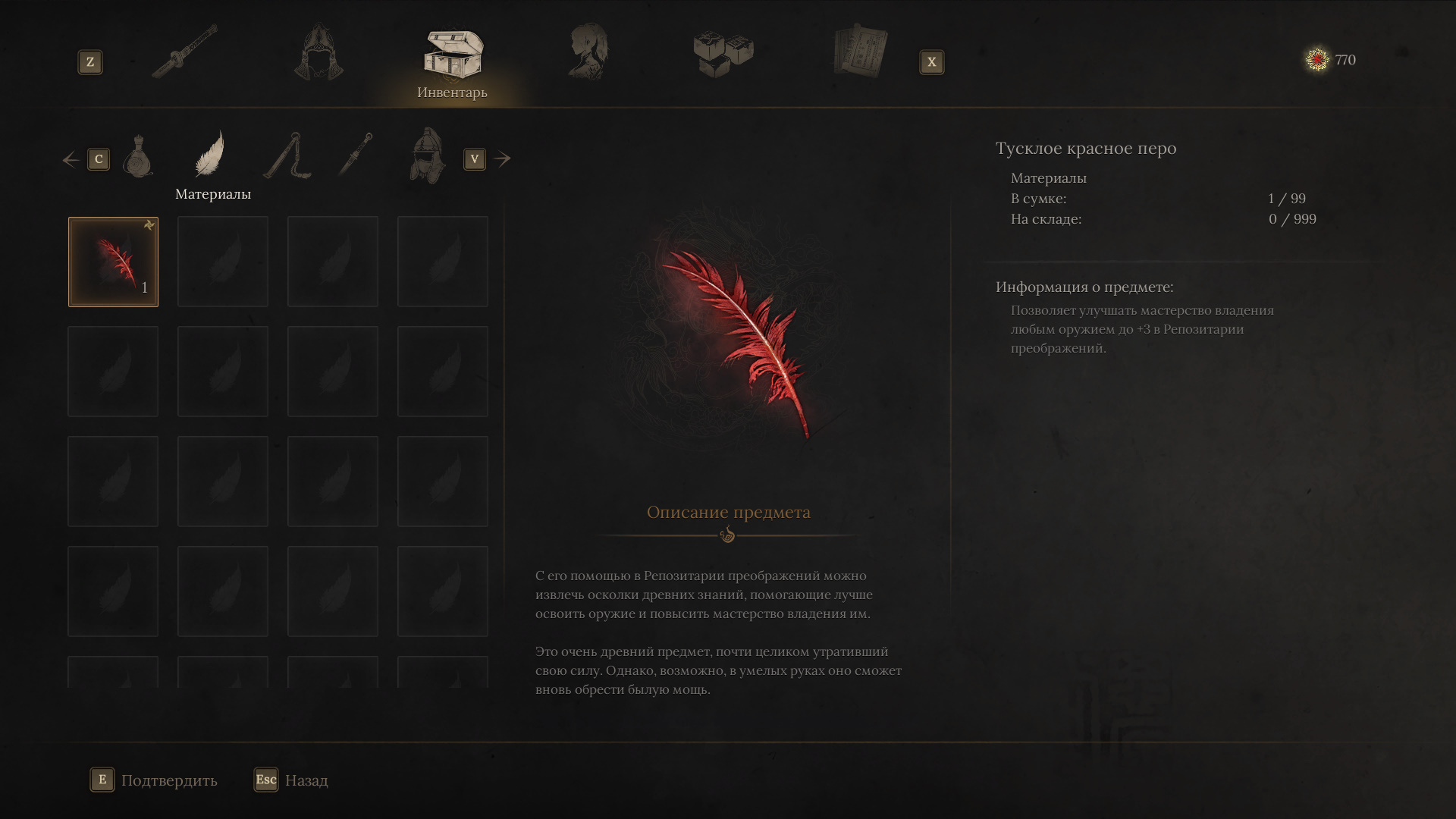 Вы возродитесь около святилища Небесной деревни. Активируйте его и в репозитарии преображений, взаимодействуйте с любым открытым узлом, чтобы увидеть, какое количество красной ртути нужно для повышения уровня. За каждое повышение уровня вы будете получать эссенцию красной ртути, которая и используется для разблокировки новых узлов.
