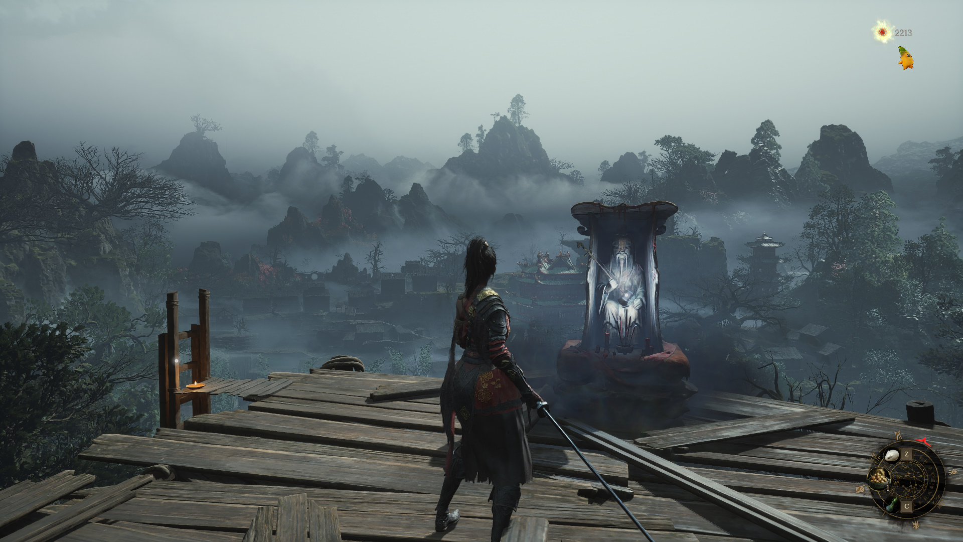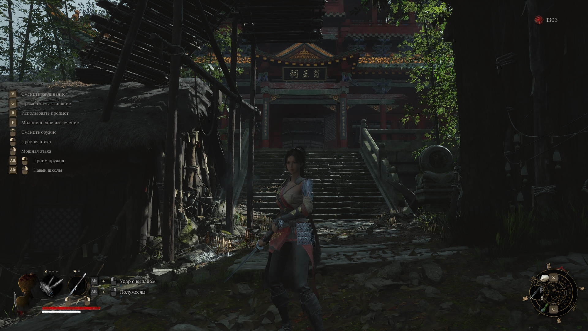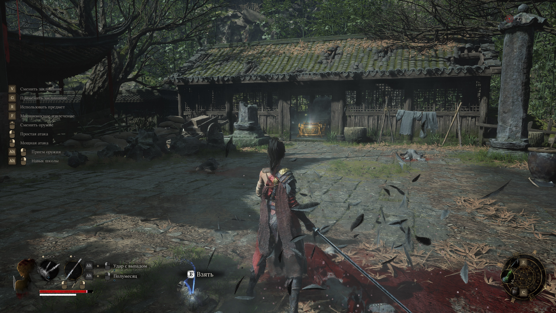 Пройдите через двор с домами, покиньте деревню. Тропа слева ведет в тупик с тусклым красным пером. Войдите в пещеру справа, зачистите от врагов и спуститесь по лестнице. Пройдите по узкому мостику, убейте разбойника и соберите добычу. Взаимодействуйте с интерактивной точкой. Вам указывают на Тайцзи. Нажмите на клавишу Y, затем на R, чтобы удалить любой жест, а после замените его на Тайцзи. Примените жест и получите эссенцию красной ртути. Идите в другую сторону и воспользуйтесь подъемником.