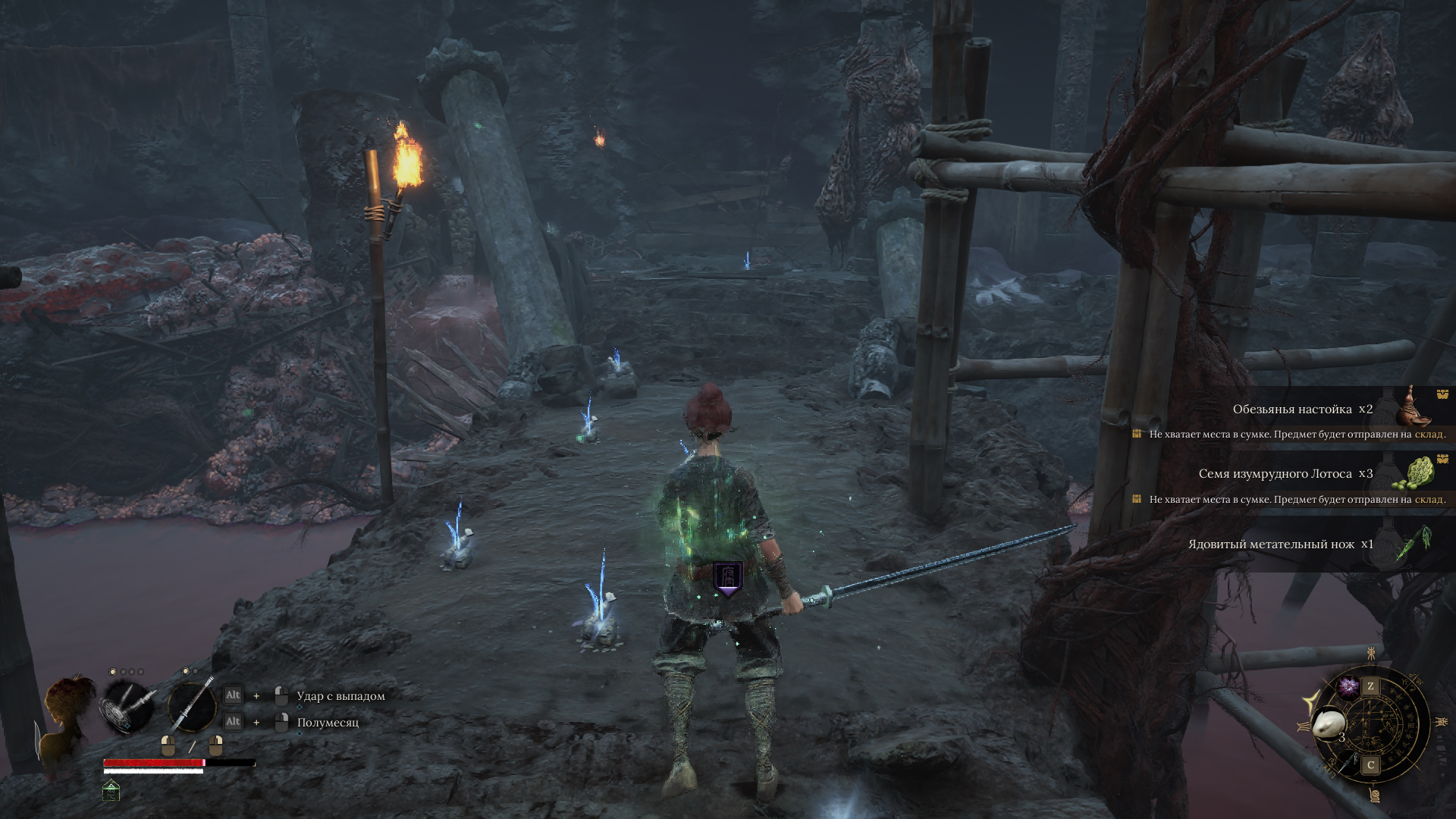 Спуститесь ниже к зданию. Обогните его справа, чтобы найти побег Красной ртути. Внутри здания соберите 2 лекарственных осадка (в течение некоторого времени восстанавливает здоровье и накладывает порчу). Спуститесь вниз, чтобы встретить Сюаня Янцзы.