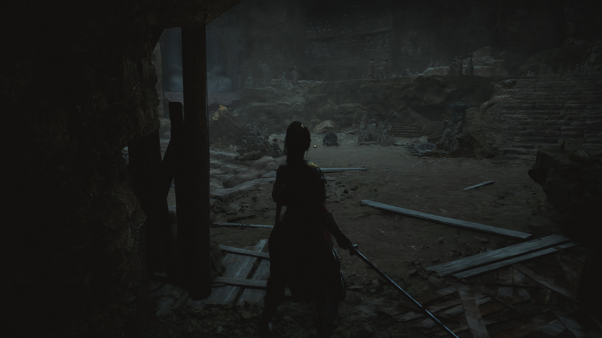 Ударьте по лестнице слева от святилища и спуститесь вниз, чтобы попасть в пещеру, где найдете первое заклинание — «Разящий клинок». Чтобы применить заклинание, нажмите на клавишу G. Для его активации нужен заряд Сил Небес. Чуть дальше на трупе валяется почка Красной ртути (+200 единиц красной ртути). Пройдите вперед и спрыгните вниз, чтобы победить монахов. С одного из них выпадут сандалии ложных монахов.