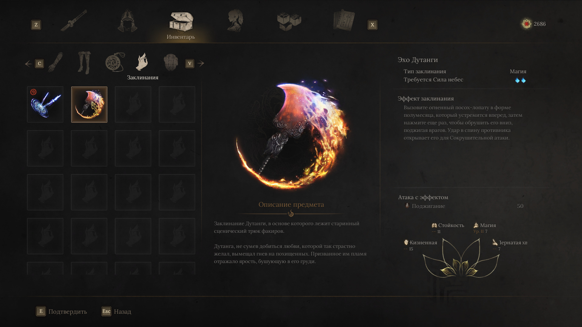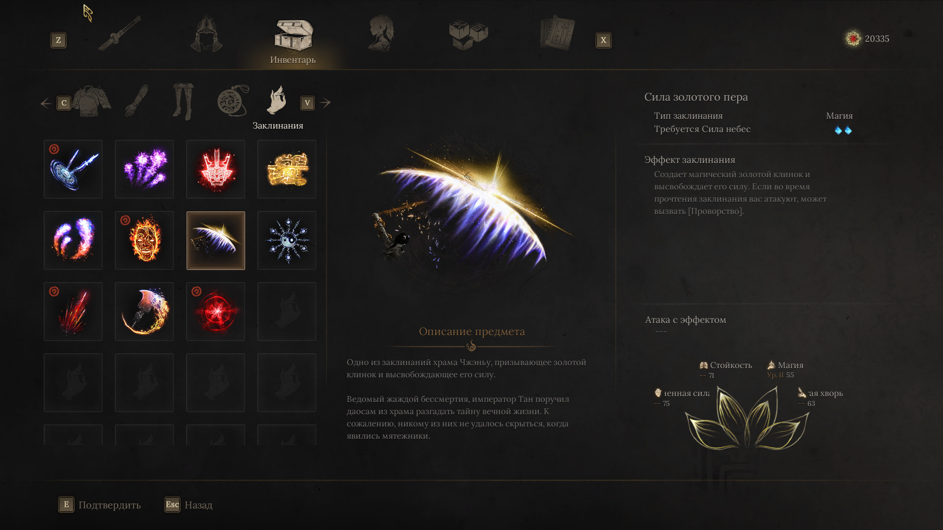 После победы над Дутангой вы получите первую костяную иглу «Пламя» для закалки оружия. Откроется меню, так что установите эту иглу в первый слот желаемого оружия. Слева указаны все пять точек, посередине есть слоты. Каждая костяная игла относится лишь к определенному типу, то есть может быть установлена в какой-то определенный слот. Можете изучить алтарь, у которого стоял Дутанга. Он посвятил его своей жене Фэн Сяовань. Вы также получили ключ от Храма Света и медную кружку, которую нужно передать Тау Циню, чтобы расширить его ассортимент. Наконец, вам дали новое заклинание «Эхо Дутанги».