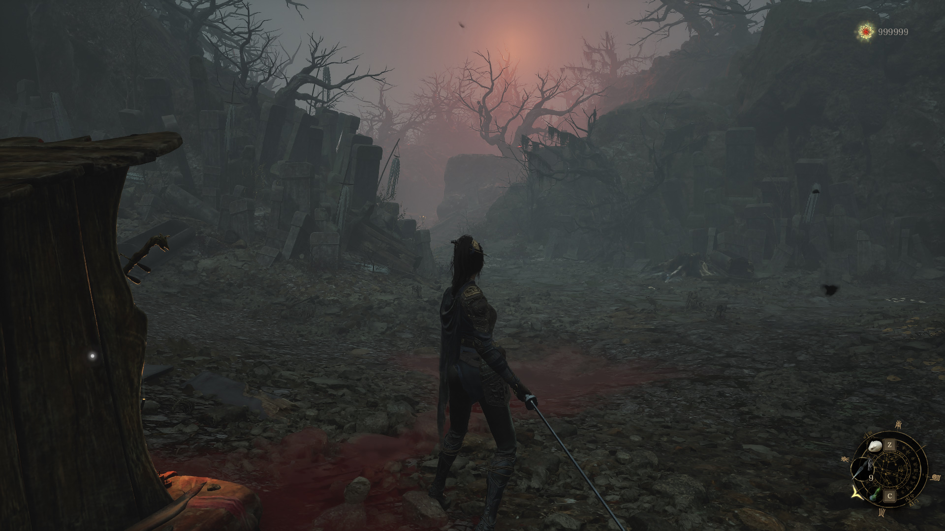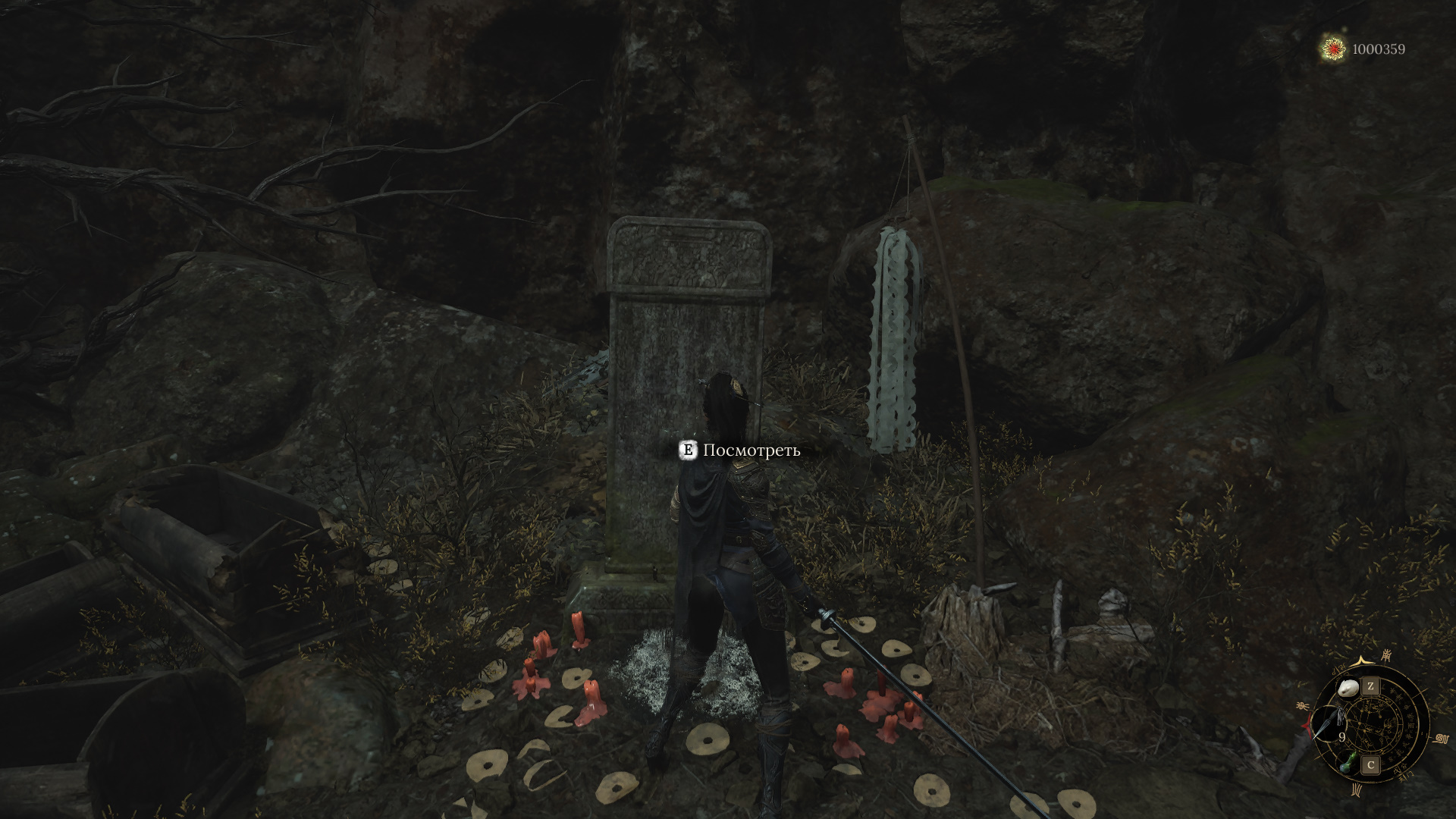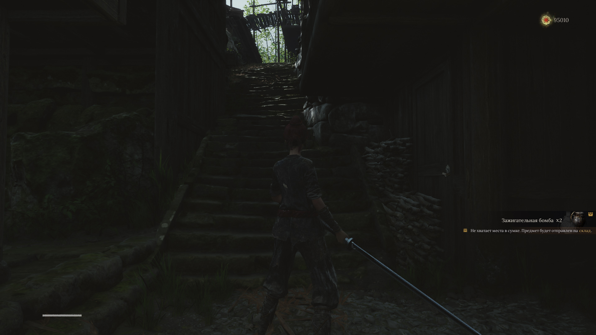 Вернитесь и продолжите движение вверх по ступеням, убивая врагов. В сгоревшей части деревни наверху подберите около противника метательный нож порчи (помимо обычного урона накладывает порчу). Пройдите по кругу, можете осмотреть могилу жены Лу Юсаня.
