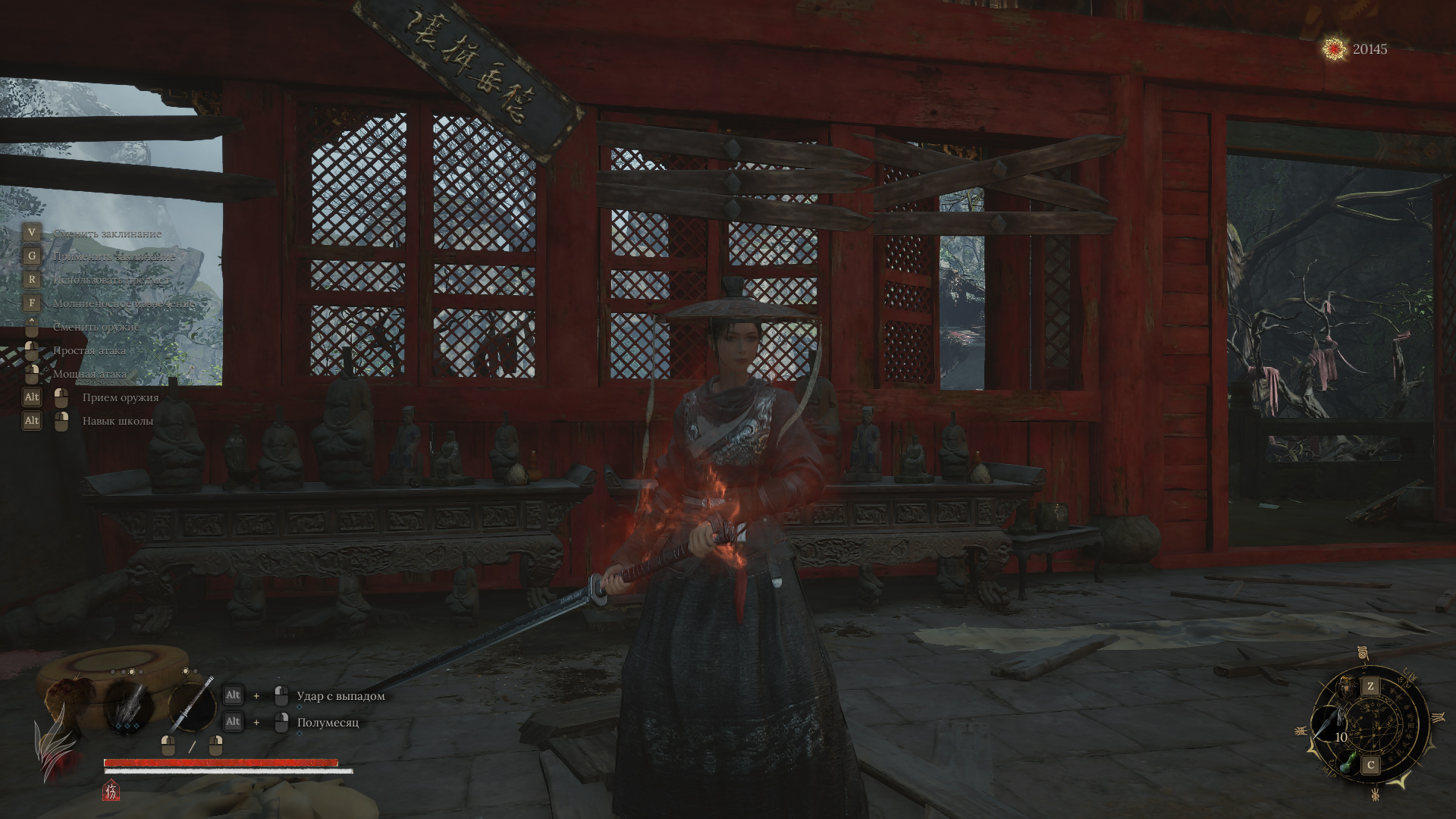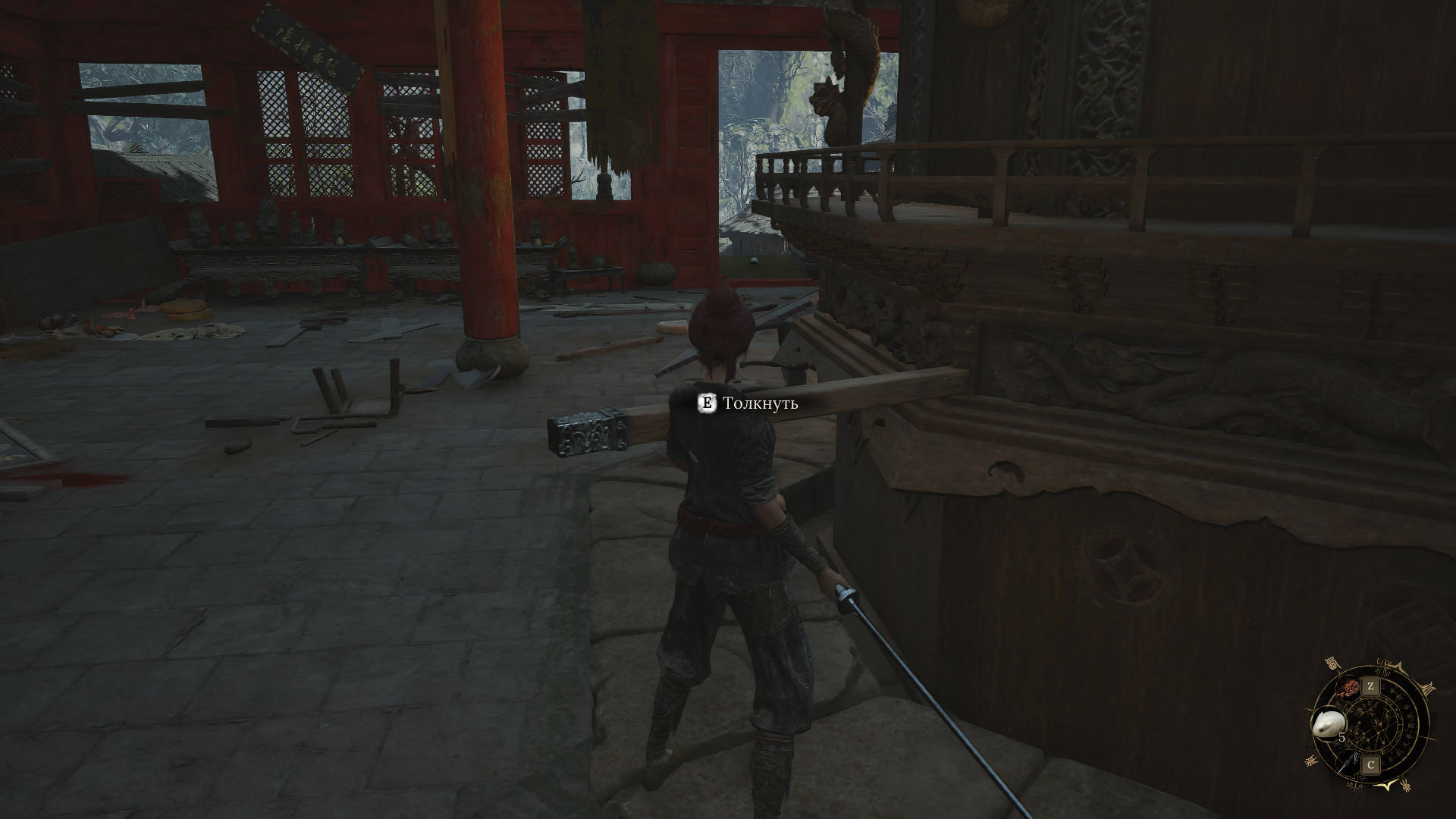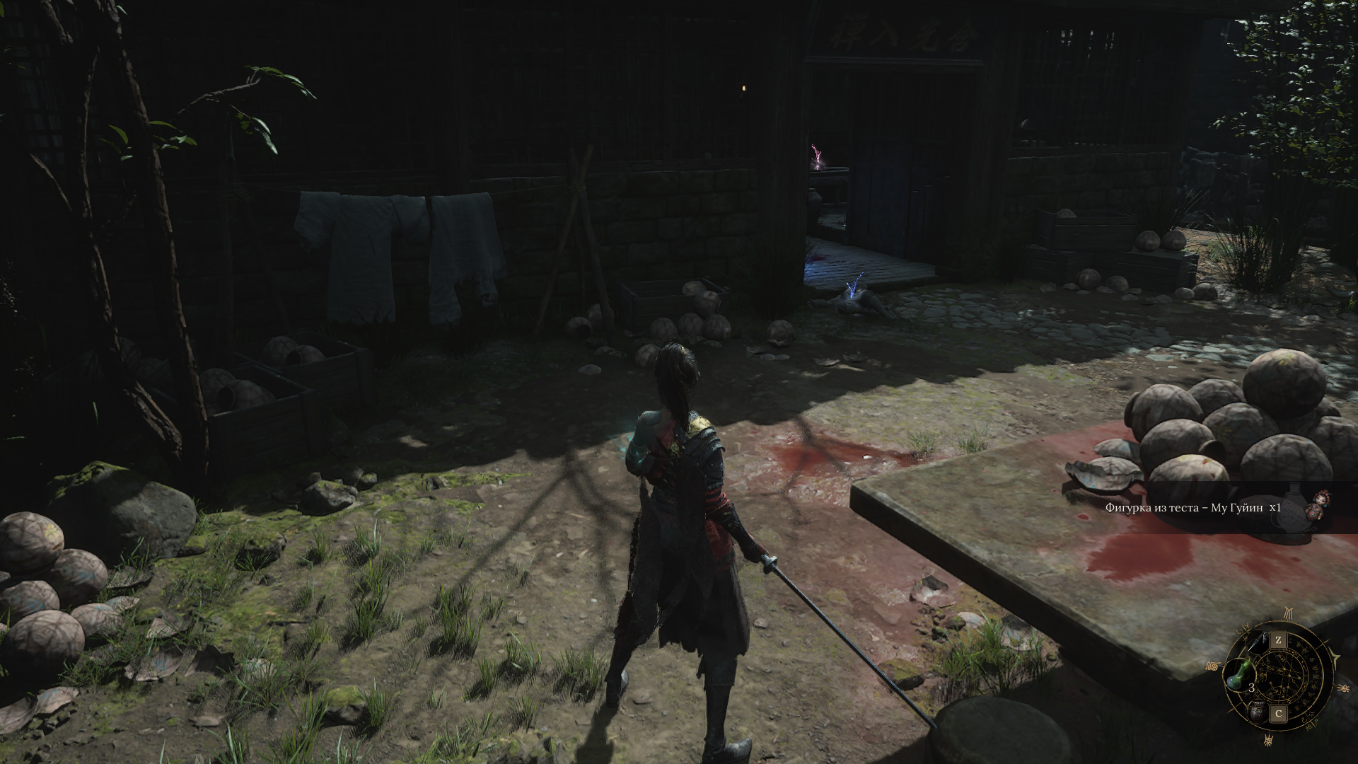 Напротив святилища есть еще одна часть двора. Зачистите ее. Ворота открываются только при помощи ключа от Храма Света. У здания справа, снаружи, валяется фигурка из теста — Му Гуйин (нужна NPC с кувшином на голове). Внутри здания есть враг и тусклое красное перо.