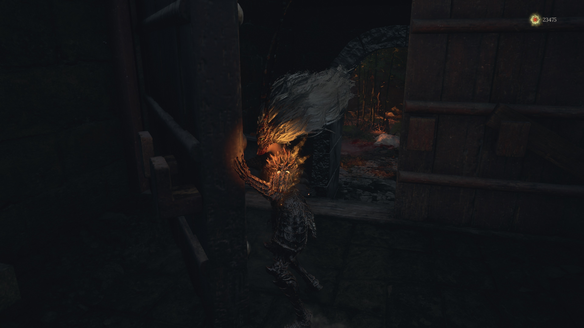 Спуститесь во двор. На этот раз здесь будут разбойники. Ворота справа теперь открыты, у ворот слева стоит воин в доспехах с копьем. Если победите его, получите материал для крафта тусклое красное перо (позволяет улучшать мастерство владения любым оружием в Репозитарии преображений до +3).