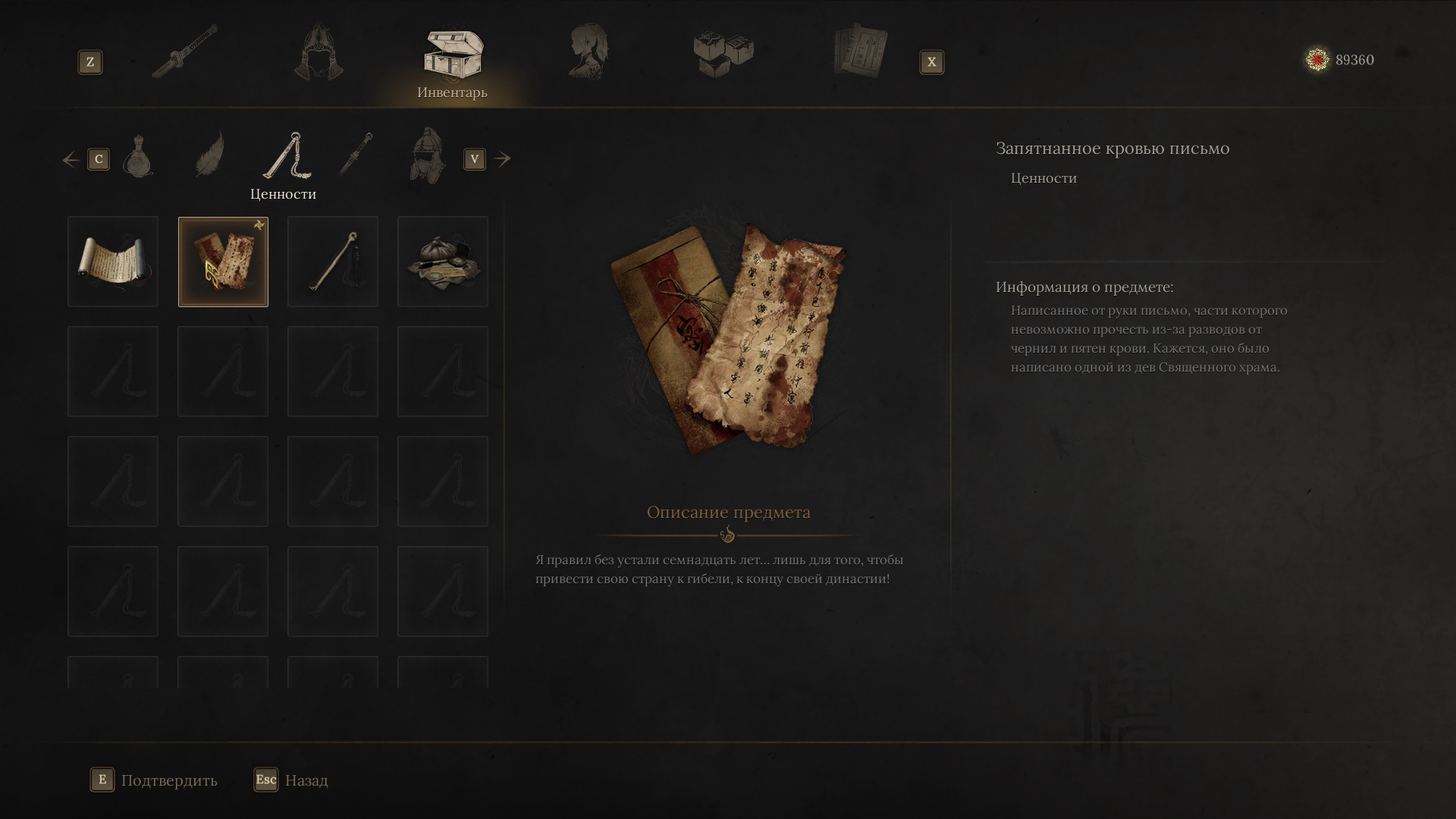 Развернитесь и идите в обратную сторону в деревню. Сразу же поднимитесь в открытый дом слева, убейте двух врагов и обыщите шкатулку, в которой спрятано божественное письмо «Бу — Парирующий блок» (повышает эффективность блоков и парирования).