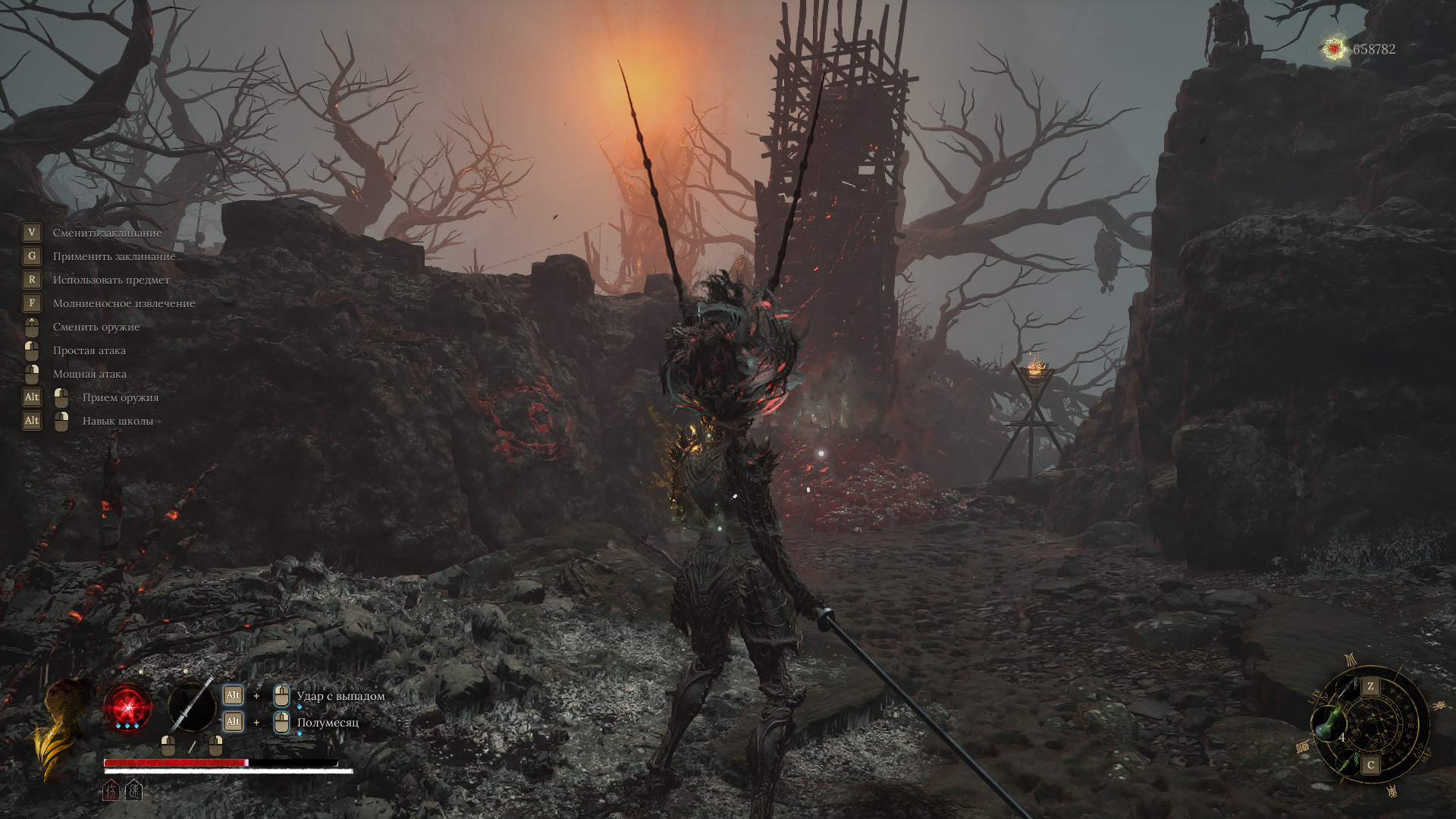 Выйдите наружу, сделайте подношение крови и активируйте первое святилище. После активации любого святилища вы можете с его помощью входить в состояние сна. В это время восстанавливается здоровье, вы также продвигаетесь по сюжету некоторых квестов, но это одновременно возрождает большинство врагов. Пока что вам также доступны склад и репозитарий преображений, в котором вы повышаете характеристики и уровень.