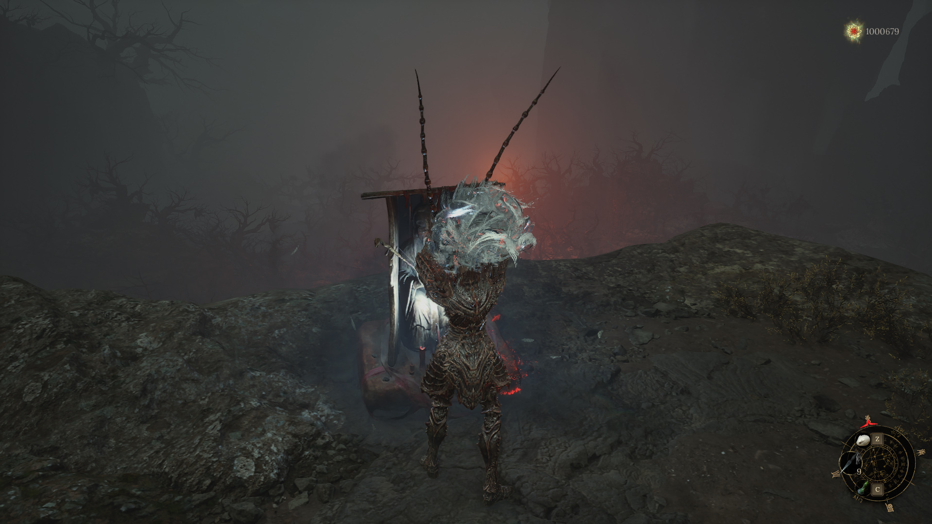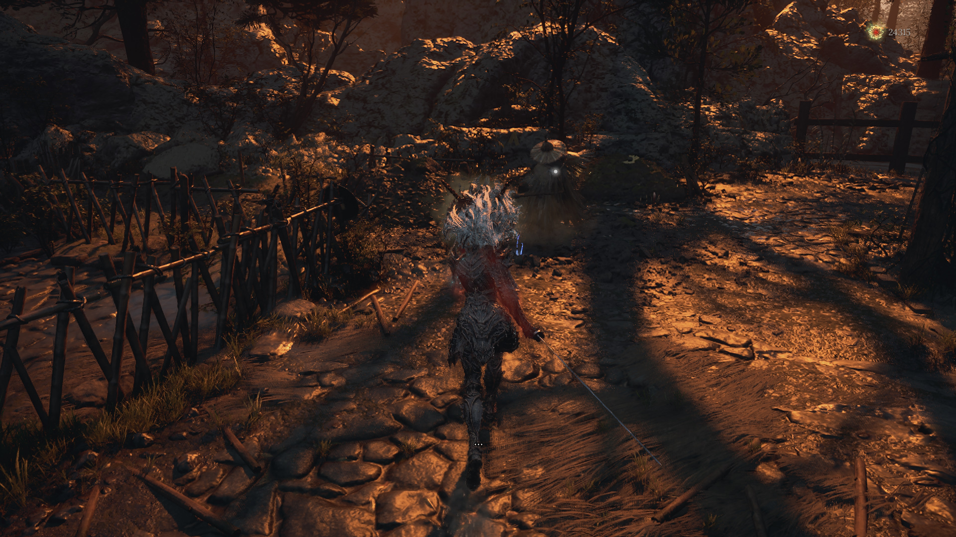 Поднимайтесь дальше в гору от упавшего дерева, чтобы обнаружить еще одного обезумевшего офицера с красными глазами. Этот воин в доспехах использует парные клинки. Победив его, вы получите сверкающее красное перо для повышения оружия до +6.