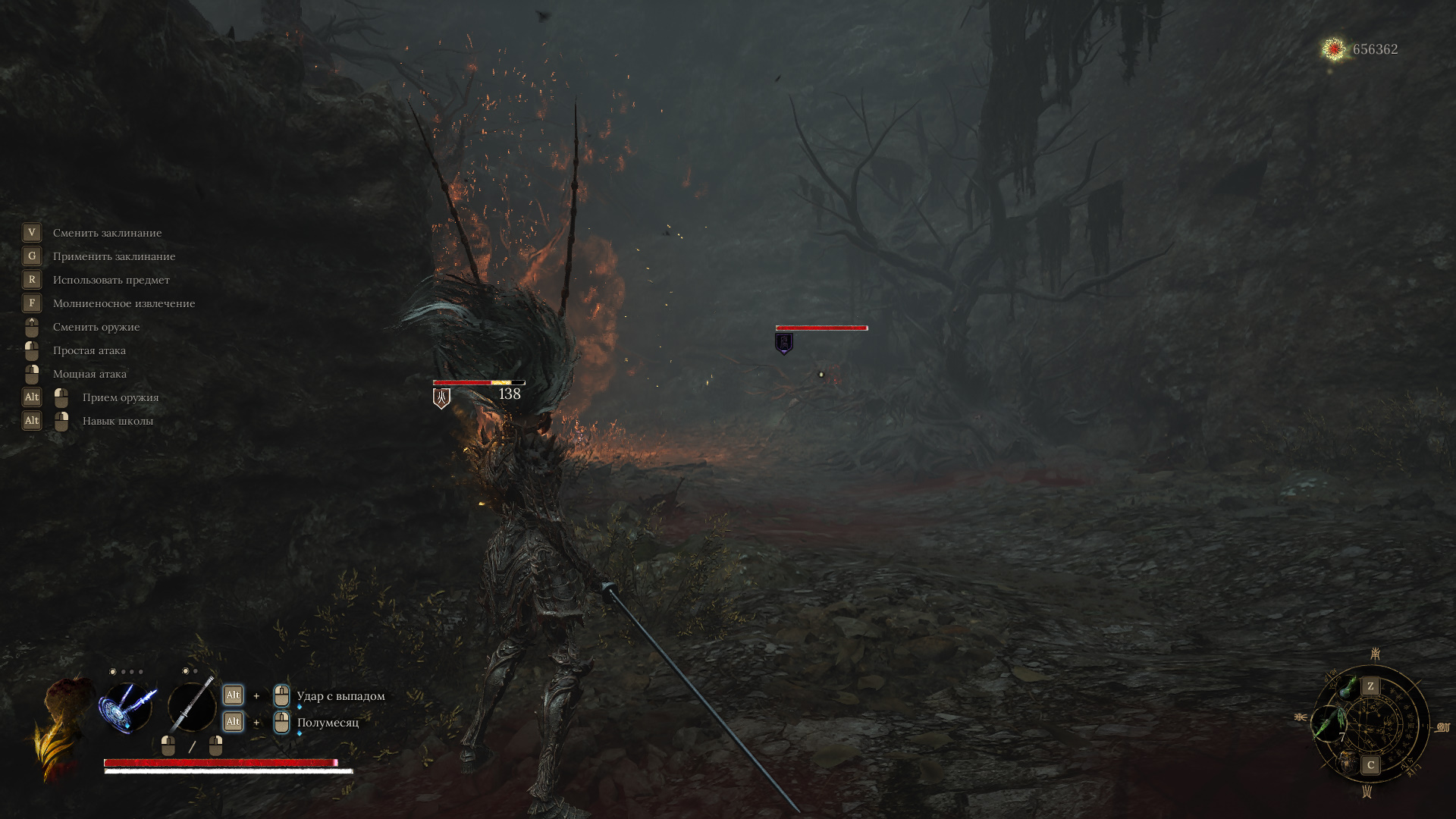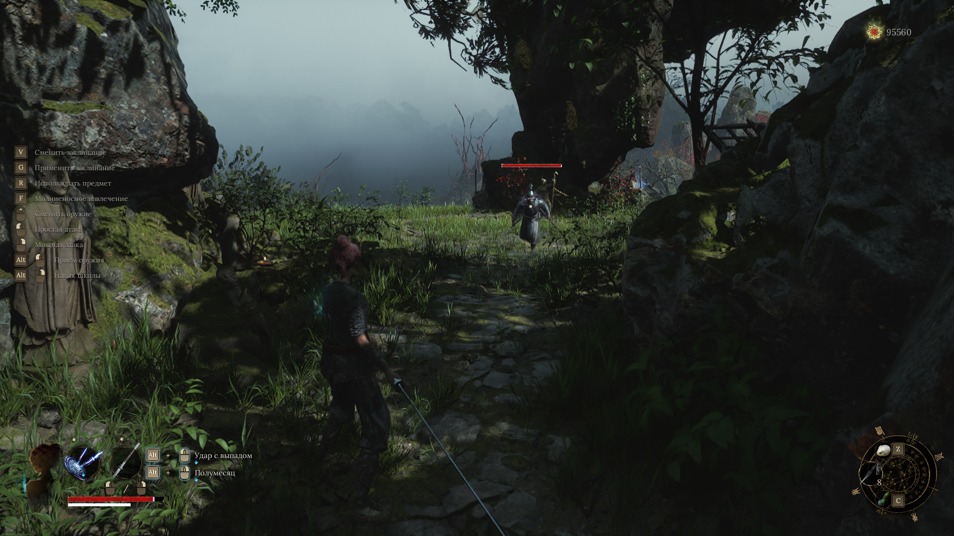 Спуститесь по склону. На выступе справа есть 3 метательных ножа (метательное оружие). Экипируйте их в меню снаряжения в предметы. Клавиши Z и С позволяют переключаться между расходниками в слотах быстрого доступа, а клавиша R — использовать (выпить зелье, метнуть нож и так далее). победите первых врагов и подберите 2 булочки в виде зайца (медленно в течение некоторого времени восстанавливает здоровье).