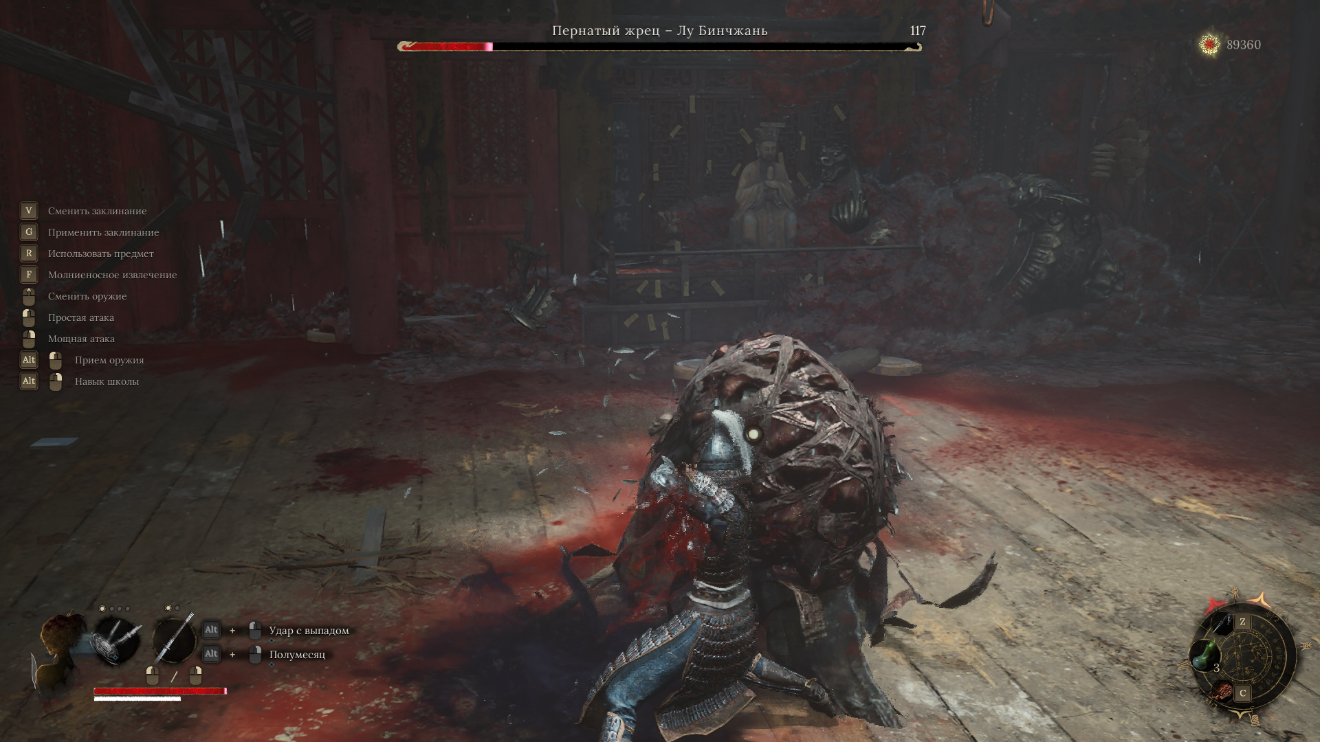 Кроме того, можете бросать метательные ножи в птиц, чтобы получать золотые перья (дает временный случайный бонус к здоровью, выносливости или наносимому урону). Сделайте подношение крови у святилища, потратьте красную ртуть на улучшения. Рядом со святилищем корчится У Ган. Можете помочь ему и пообщаться. Он представится правой рукой Дутанги и даст 2 булочки в виде зайца. Если пройдете влево от алтаря в открытый дом, вас атакует монстр в кувшине. За победу над таким врагом вы получите тусклое красное перо, пернатую ветвь (дает 5 зарядов Силы небес, но увеличивает безумие), семя Изумрудного лотоса (снимает отравление и лечит яд).