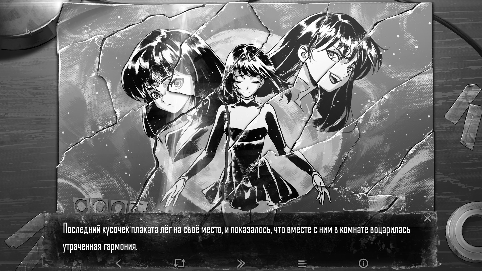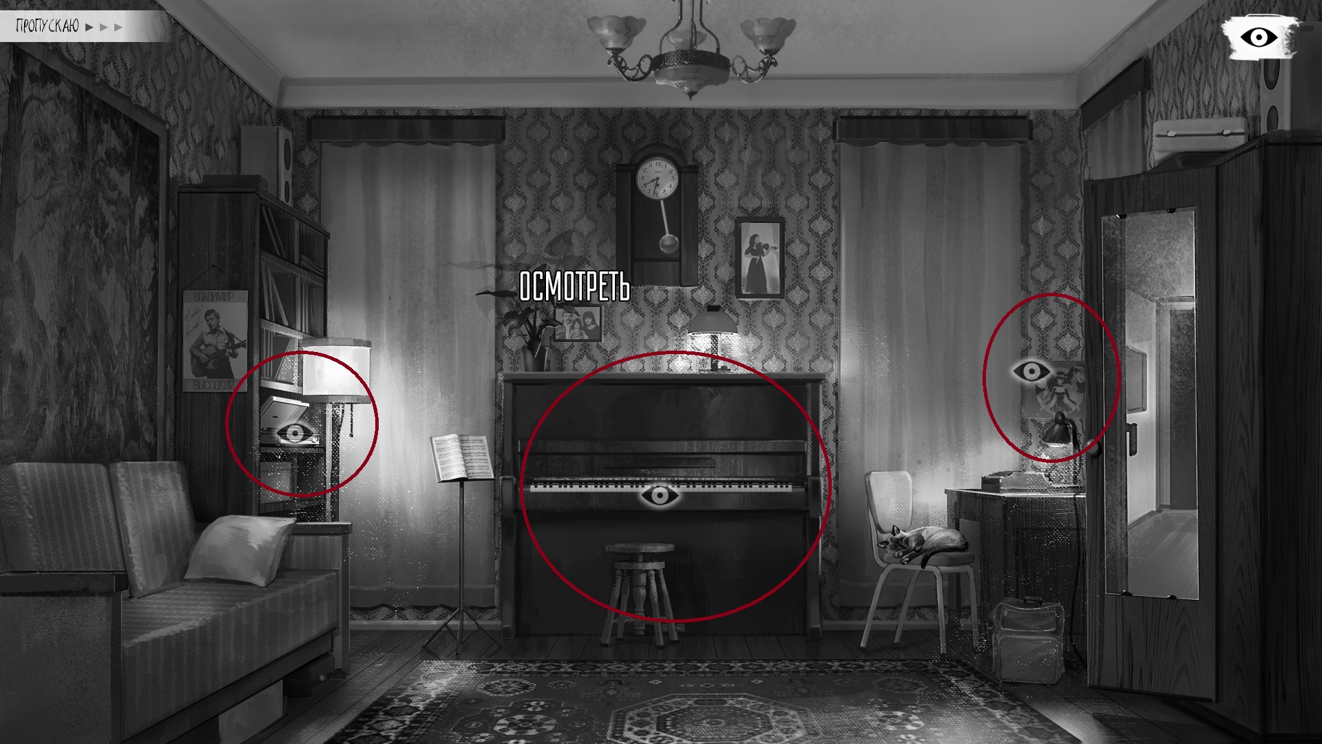 Чтобы продолжить, после изучения 3 интерактивных объектов жмите на слово «Осмотреться». Вы изучите фотографию родителей Полины, затем по неосторожности заденете пианино, спугнете кошку Джоанну, которая разорвет плакат «Сейлор Мун». Начнется мини-игра, в ходе которой этот плакат нужно собрать.