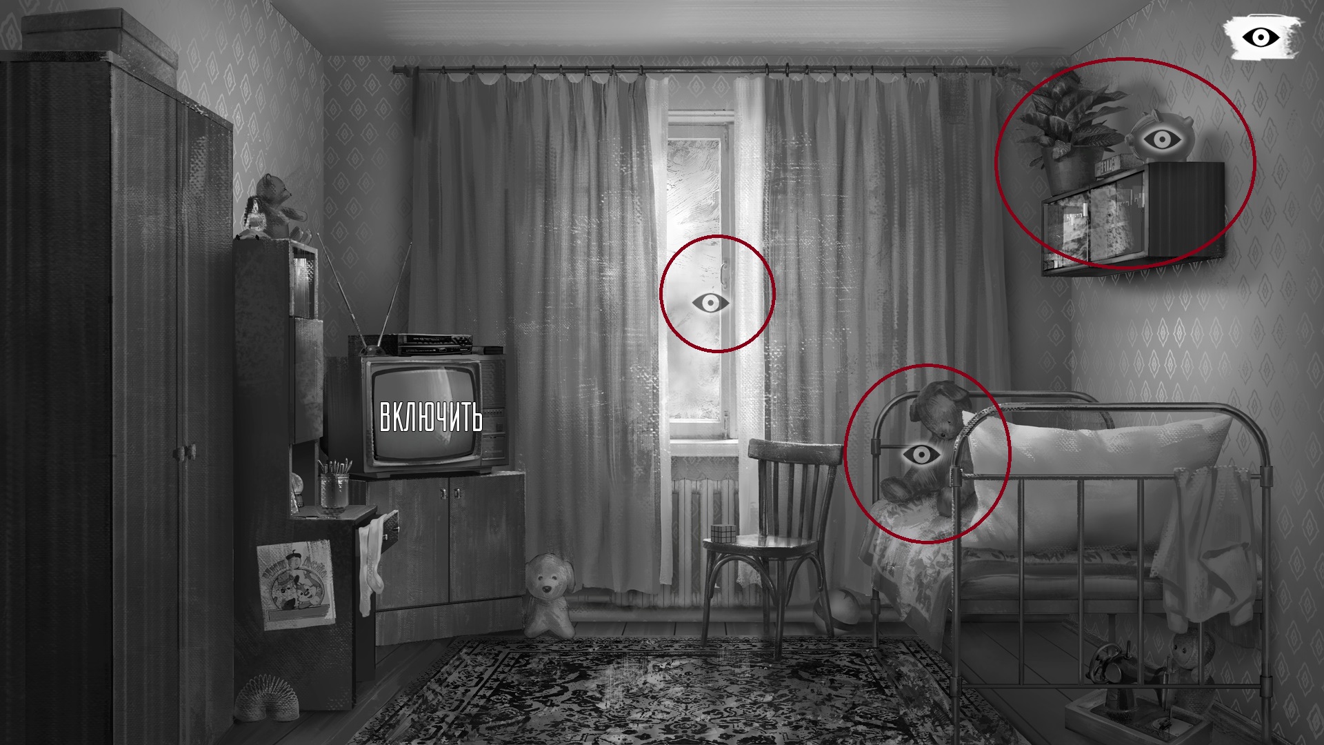 После того как Оля выпрыгнет из-за шторы, вы отправитесь в ее комнату. Здесь нужно осмотреть еще три интерактивных объекта: