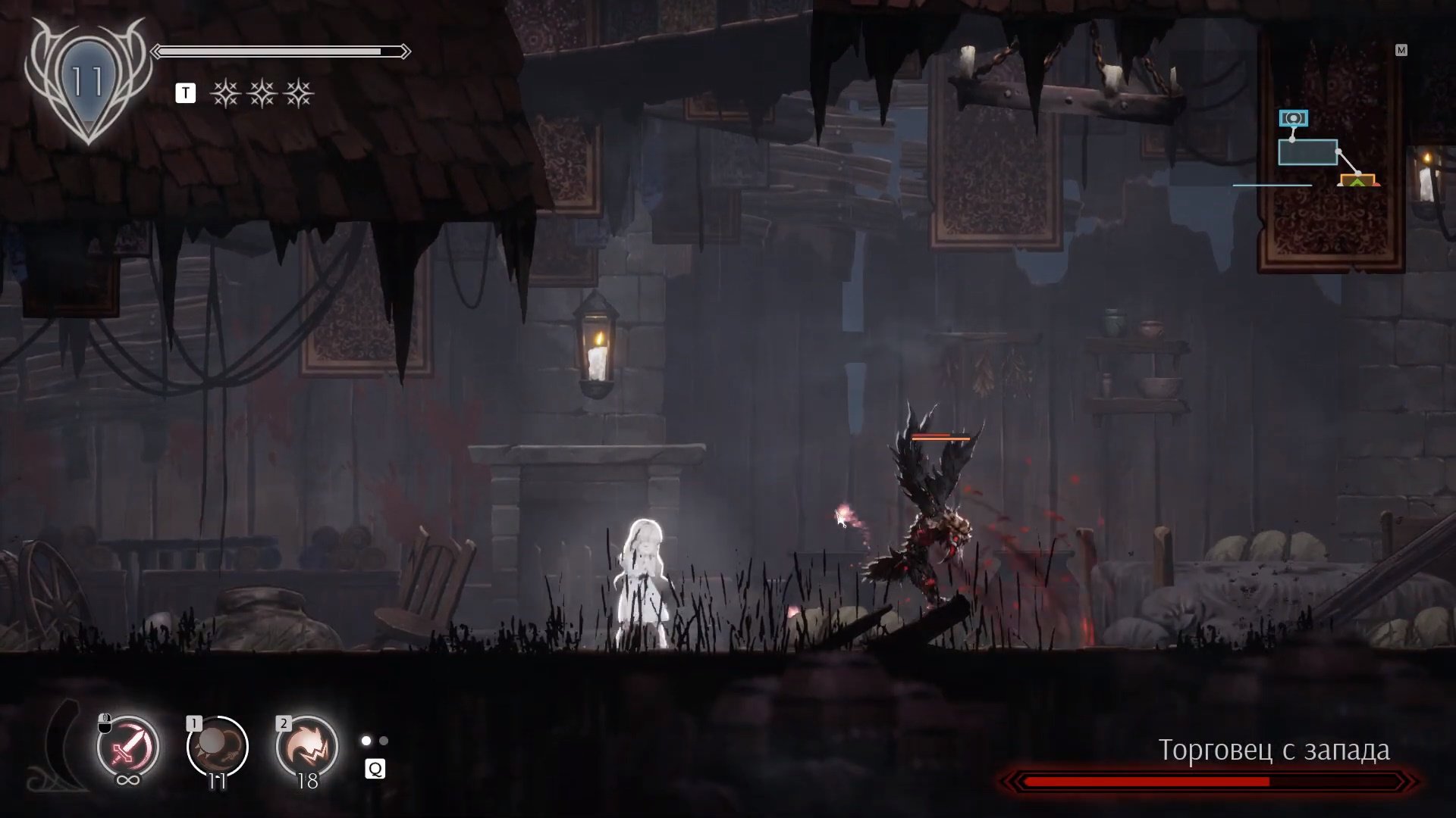 Следующее место отдыха — «Разрушенная хижина». Двигайтесь чуть правее и пройдите вглубь экрана, на соседнюю улицу. Следуйте влево, убивая врагов. В самом дальнем доме будет прыгающий и плюющийся ядом здоровяк. Убив его, вы сможете забрать мерцающий предмет — осколок амулета, повышающий здоровье. Потяните за рычаг и спрыгните вниз. Прыгайте по деревянным платформам, не падая в воду. Эта красная вода ядовита и наносит урон. В конце пути будет рычаг, открывающий проход наверх. Так вы создадите короткий маршрут. Вновь вернитесь влево и неподалеку от последнего дома найдите проход вглубь экрана. Следуйте туда, чтобы попасть на небольшую локацию с Торговцем с запада. Победит е мини-босса, чтобы получить его дух (ворон будет атаковать врагов, увиденных издали). Во время боя ждите, когда враг полетит на вас, уклонитесь, и пока тот бьет в пустоту, контратакуйте.
