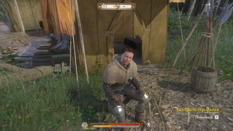 Поговорив с ним, заявите, что умело орудуете мечом. Спускайтесь вниз к частоколу, где вас ожидает фехтмейстер Ванек. Победите его в бою на мечах, а затем вернитесь обратно к Эрику и смотрите видеоролик с появлением того самого господина. Так вы узнаете имя своего врага.