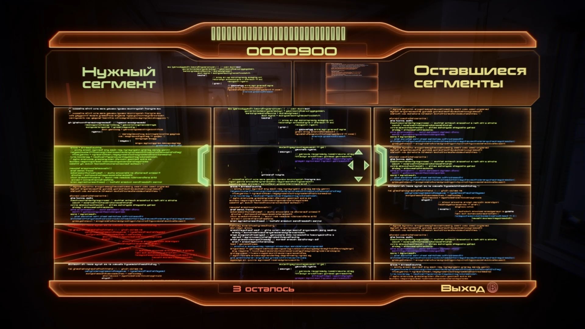 Для взлома блоков данных или компьютеров нужно подобрать сегмент кода визуально идентичный тому, что показан в подсказке сверху. Сегменты отличаются цветом некоторых строк и версткой, так что найти глазами нужный будет несложно. Трудность заключается в другом — лента с сегментами довольно медленно прокручивается, а курсор перемещается по ней только последовательно. Поэтому нужно избегать красных ячеек, обходя их с помощью стрелок (или крестовины геймпада). Когда найдете подходящий сегмент — нажмите «Пробел» (или кнопку A на геймпаде), чтобы подтвердить выбор, а затем ищите следующий из подсказки выше.
