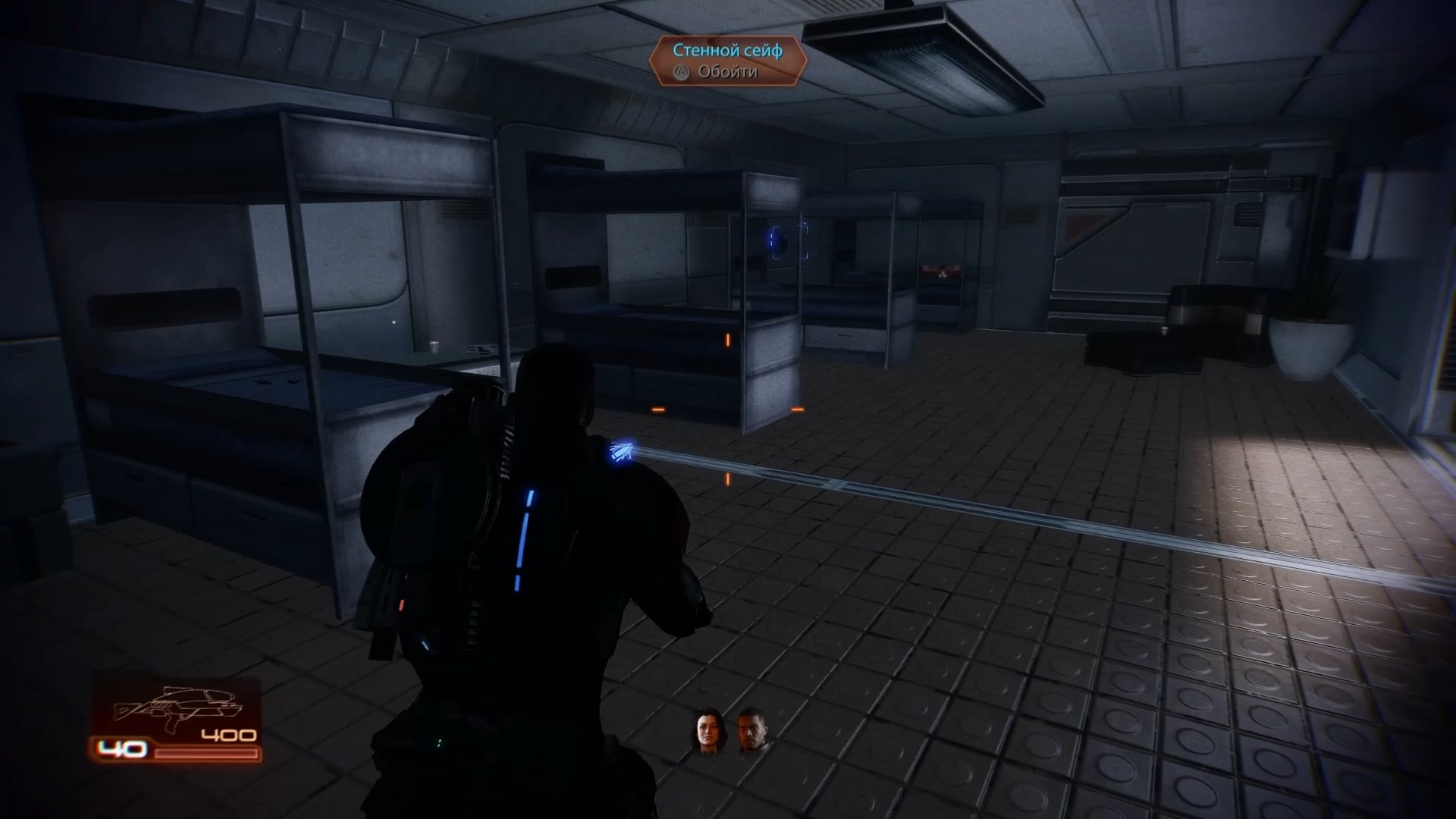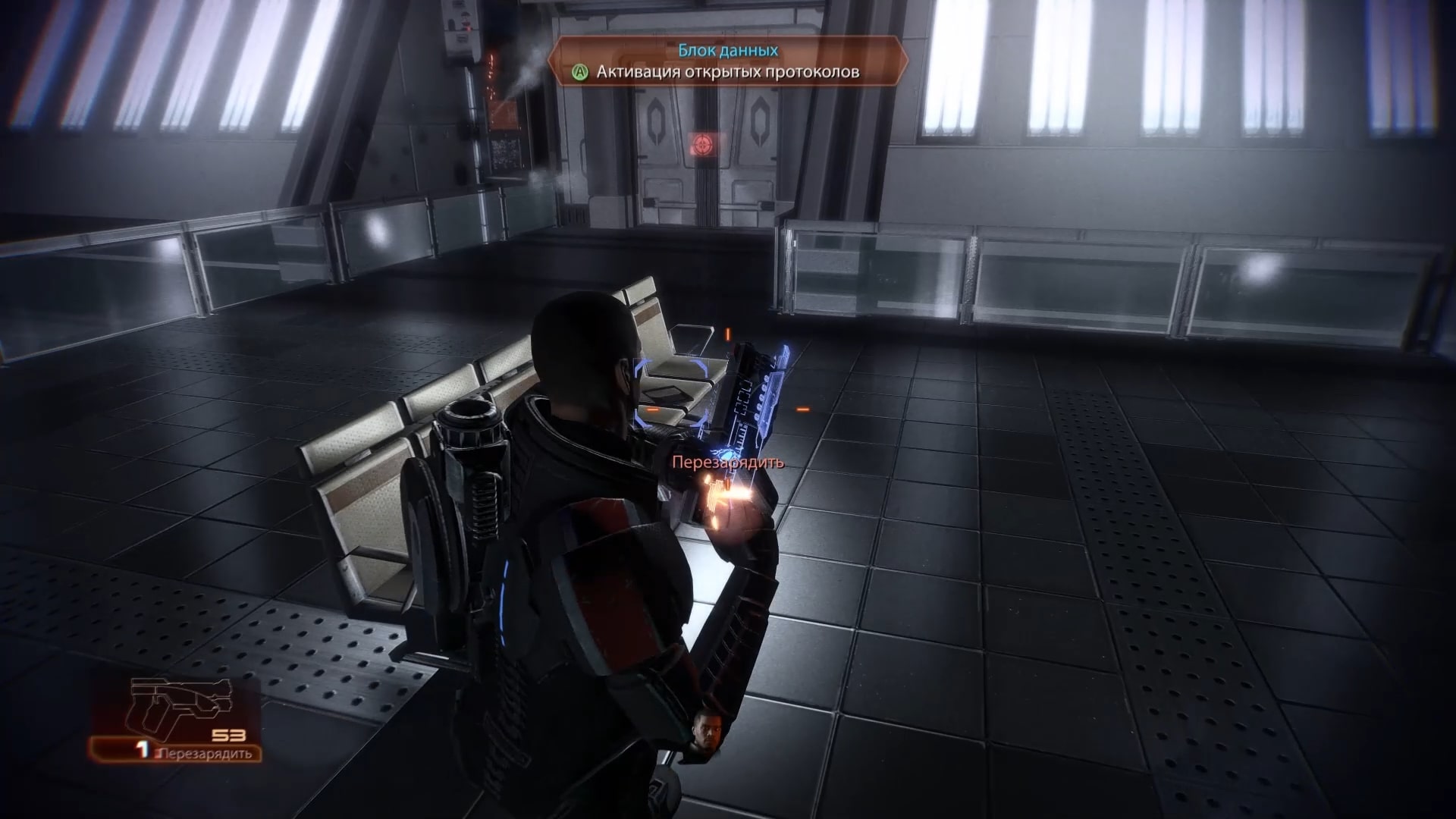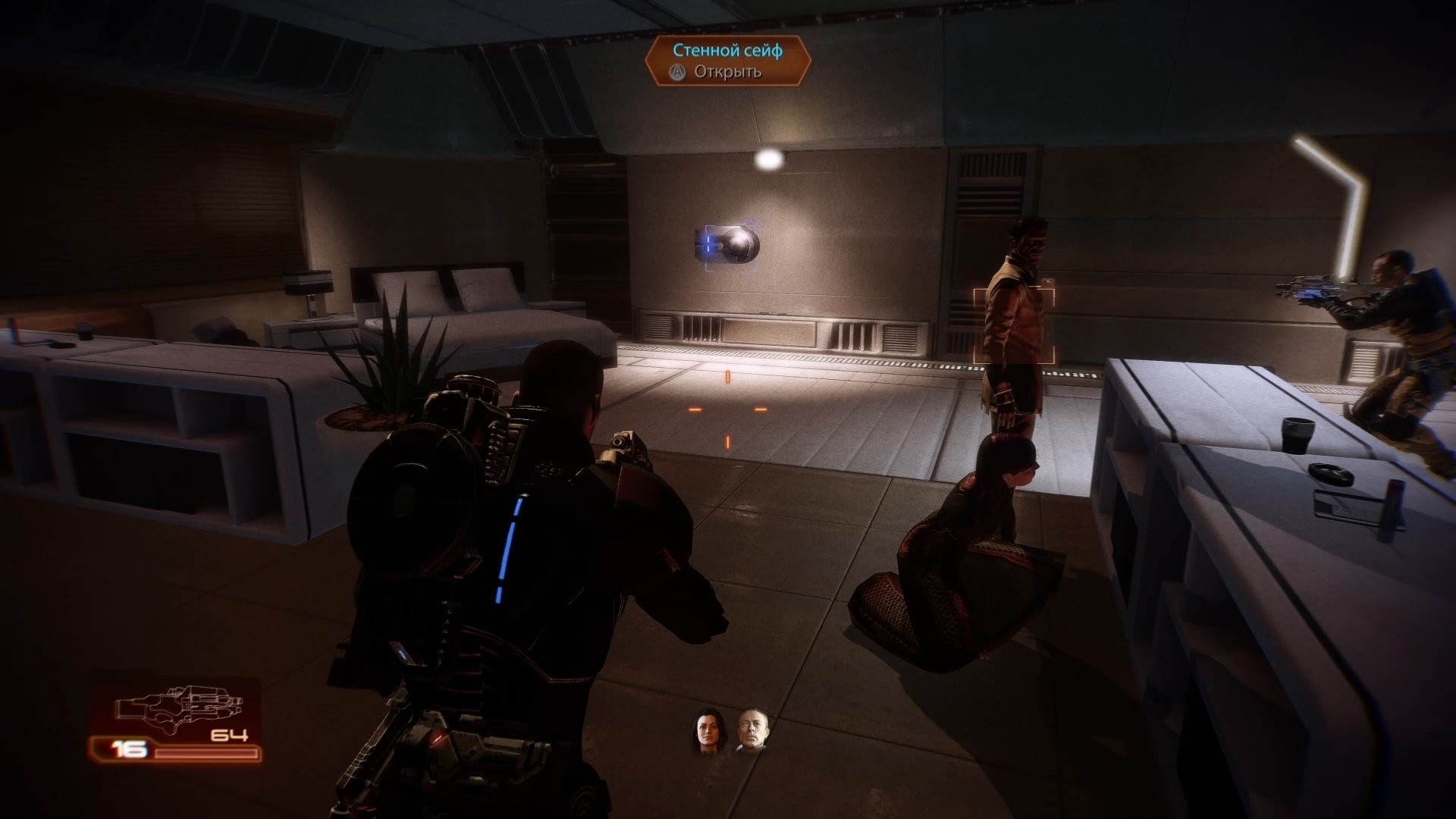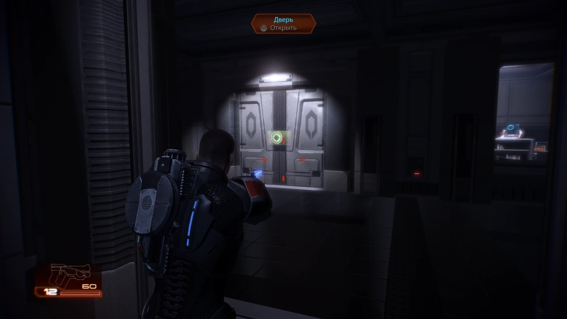 Подождите пока Шепард встанет и подойдите к сейфу с пистолетом, следуя по желтым маркерам. По ходу дела игра научит прятаться за укрытиями. Вскоре окажется, что у пистолета нет боеприпасов. Подберите один магазин впереди перед закрытой дверью.