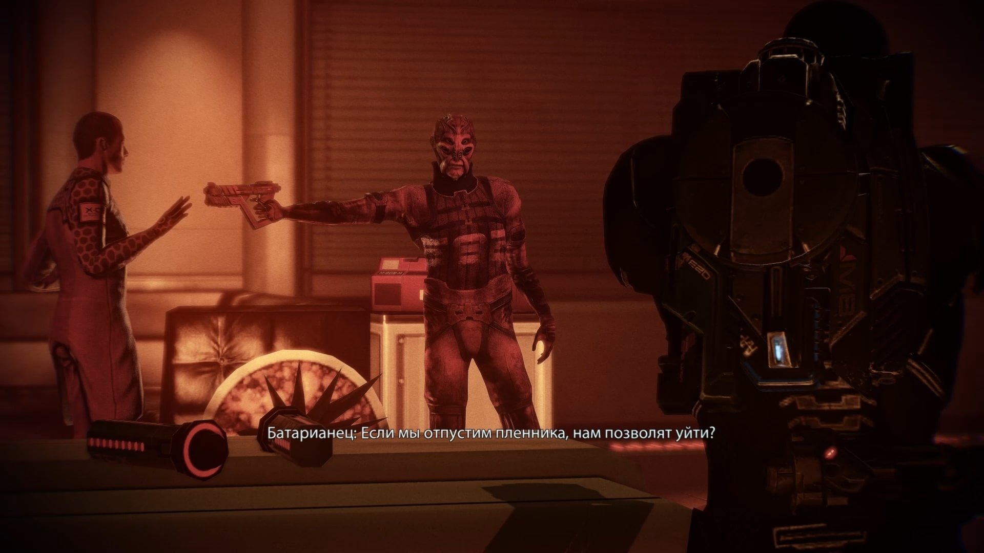 Слева по коридору будет дверь, за которой держат помощника Мордина. Если хотите выполнить побочное задание, заходите внутрь и после короткого разговора ассистента отпустят (очки «Героя»), либо вы заберете его силой (очки «Отступника»). Также ассистент может погибнуть, если приказать союзникам выстрелить в батарианцев во время диалога.