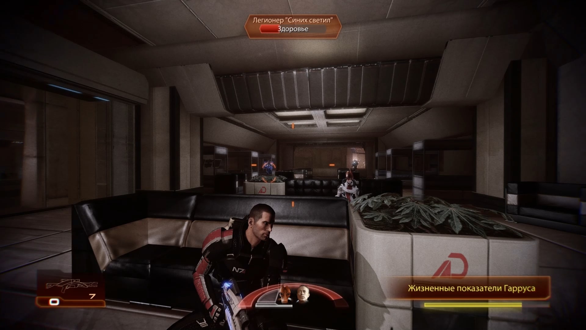 После разговора с Гаррусом начнется новая битва. Из окон начнут лезть бойцы «Синих светил». Среди них будут легионеры со щитами. Против них поможет взрывчатка или биотика.