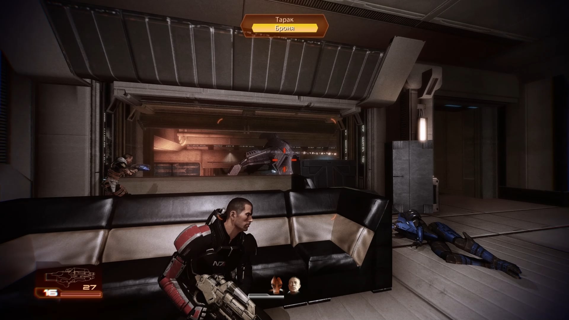 После победы над Джентой снова нападут с нижнего этажа — расстреливайте их из комнаты сверху, как и при первой встрече с Гаррусом. Постарайтесь не подпускать центурионов к балкону. После битвы со стороны окна нападет Тарак за штурвалом летательного аппарата.