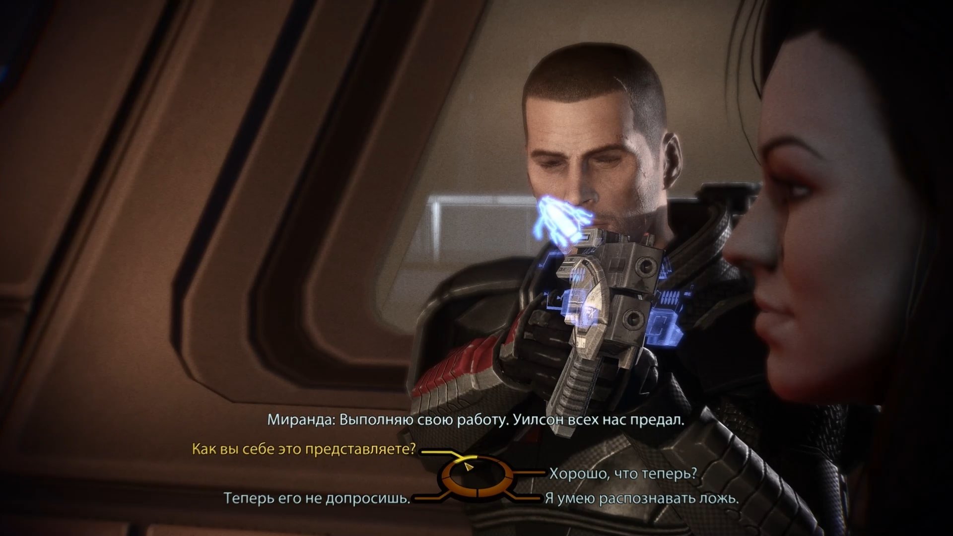 После разговора отряд окажется на борту челнока. В ходе полета Миранда задаст ряд вопросов о событиях первой Mass Effect. Их количество зависит от прохождения предыдущей игры и наличия перенесенного оттуда персонажа. Если вопросов будет много, то постарайтесь хорошенько подумать перед каждым ответом.