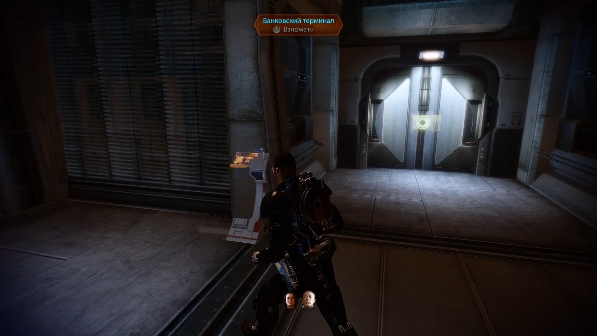 После победы в сражении хорошенько исследуйте окружение. Возле двери в конце коридора можно найти банковский терминал, взлом которого наградит 5000 кредитов. А сама дверь ведет в небольшое складское помещение, где можно раздобыть боеприпасы для тяжелого оружия.