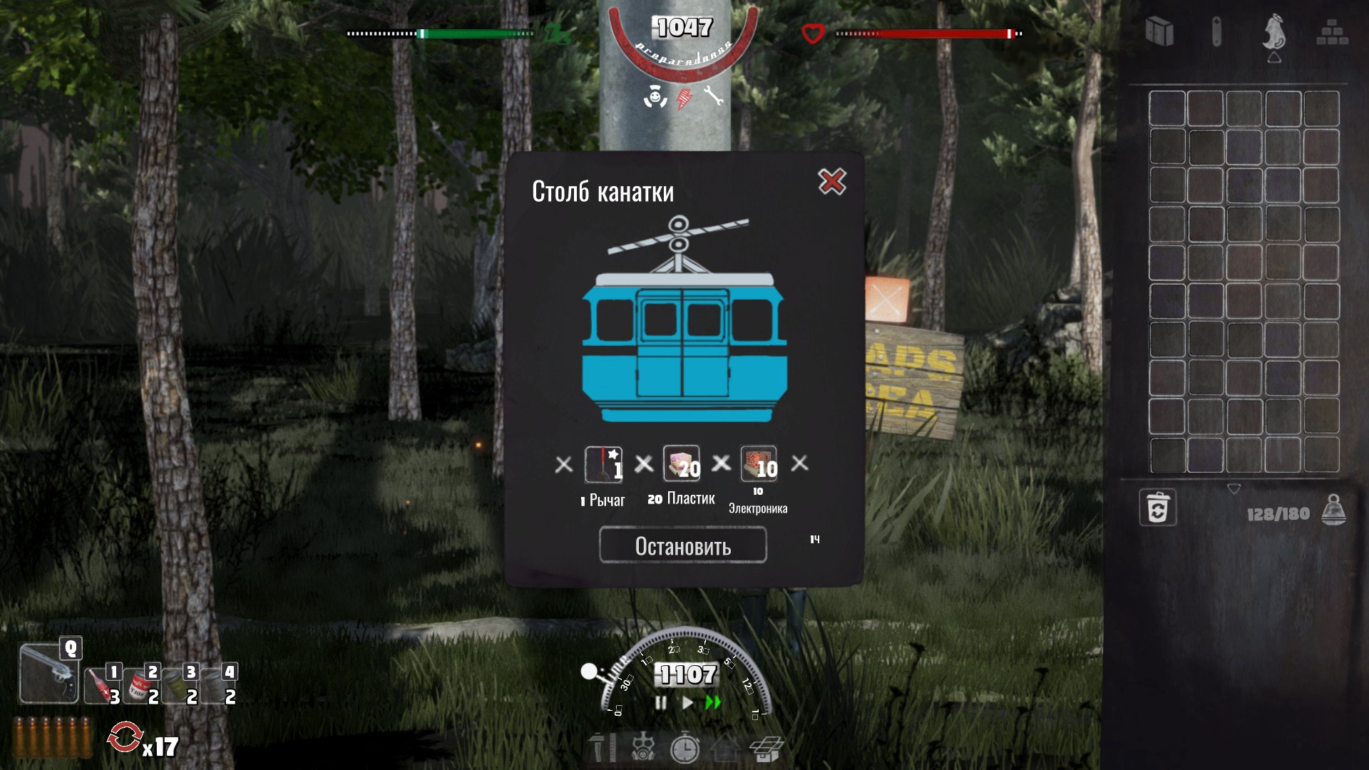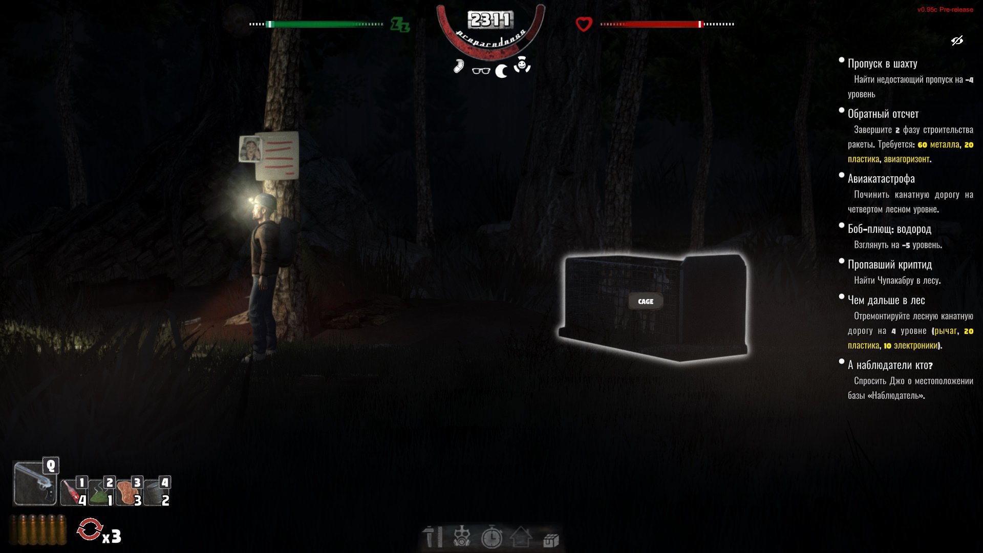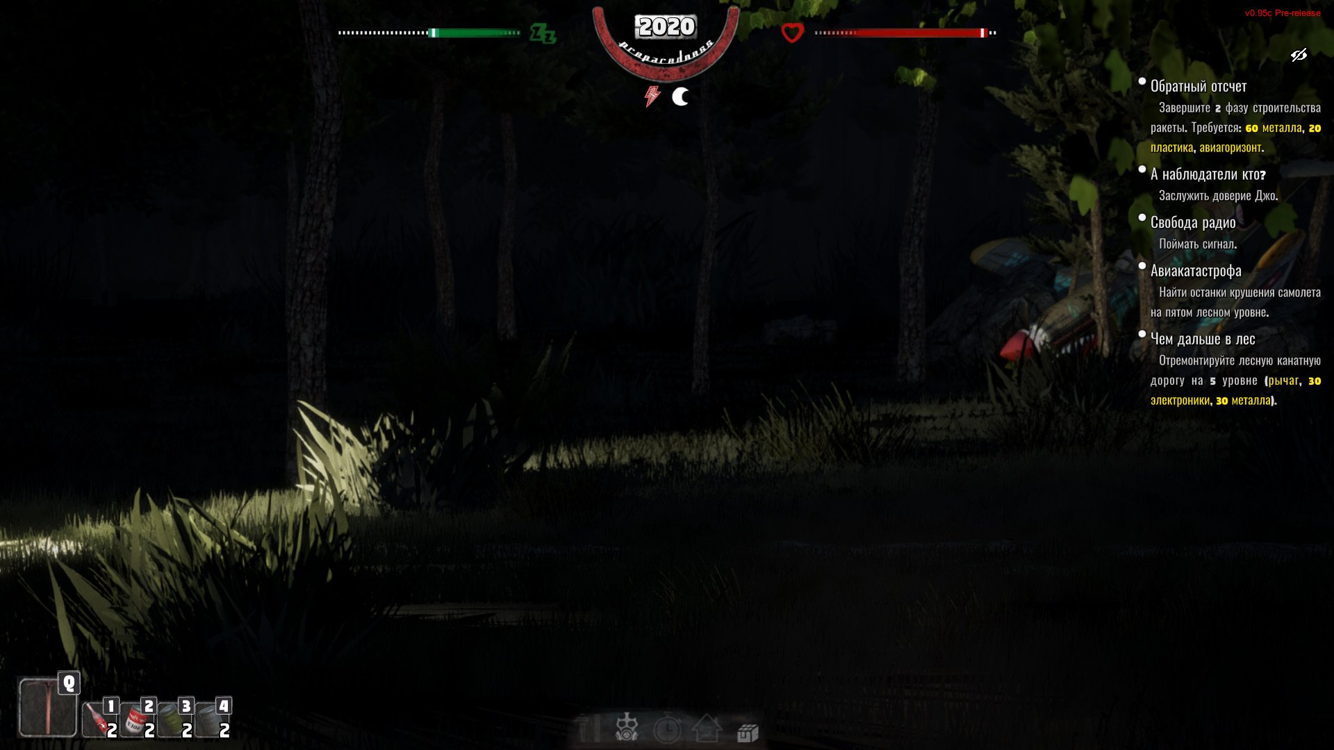 Когда отремонтируете канатную дорогу и сможете добраться на уровень Лес 2-1, обязательно вернитесь домой и убедитесь, что создали на верстаке биту. Без нее в дальнейшем не обойтись! Для ее крафта потребуется всего-то 5 древесины. Экипируйте предмет. Вы можете переключаться между голыми руками и битой клавишей Q. В дальнейшем второй слот будет заполнен киркой, топором, ножом или револьвером.