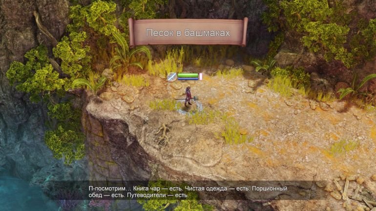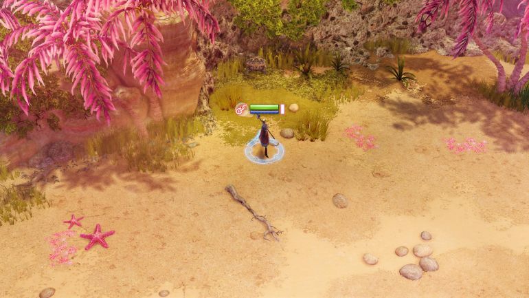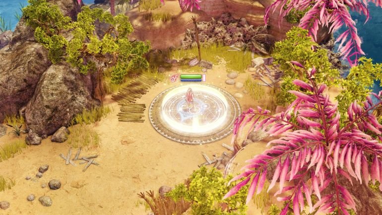 Пройдите направо по мосту, победите первых противников, используя магию. Если запас маны закончился, то просто бегайте от врага, пока она не восстановится. После смерти всех автоматически откроются ворота справа. Идите через них и прыгайте с выступа на пляж внизу. Спуститесь вниз экрана, чтобы под розовой пальмой найти первое перо на локации.