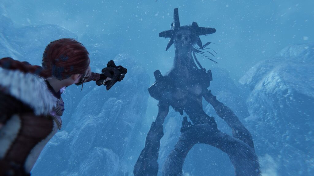 Соберите ягоды и еще одну записку Падших справа (4/25). Доберитесь до колокола и ударьте по нему. Так появится ваш первый босс. Огромный монстр с маской черепа на голове. Первое, что нужно знать — для победы нужно ударить трижды в каждый колокол на монстре. Карабкаться вы может только по тем частям тела, которые покрыты длинной шерстью. Можете сделать это, подбежав к лапам монстра сзади. Но лучше всего подняться по каменным стенам в одной из частей локации. Поднимаясь вверх, берите паузы, поскольку монстр будет периодически пускать ледяной поток, который собьет главную героиню со стены, если та за нее держится. Да и выносливость нужно периодически восстанавливать (ничего не делая). Снизу также следует собрать ягоды и куски мяса у костров. Еда не только восстанавливает сытость, но и восполняет шкалу здоровья. Не забывайте греться у костра. Один такой костер есть на вершине каменных стен.
