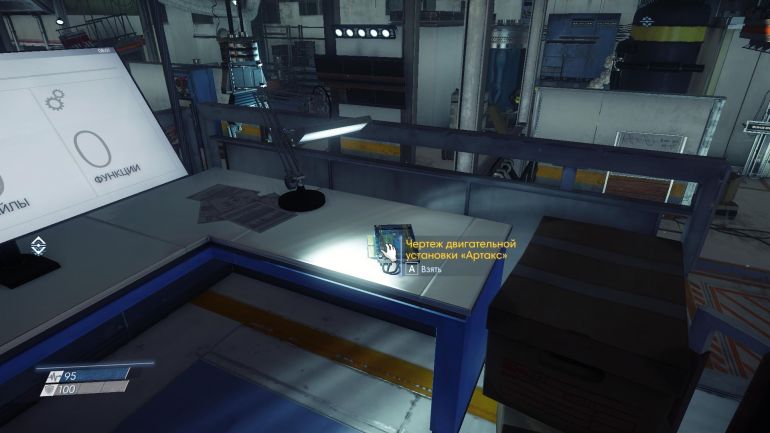 Чтобы попасть к терминалу, где лежит чертёж «Артакс», подойдите обратно к шлюзу и встаньте лицом к нему. Слева есть белые тюки — по ним запрыгивайте наверх и проберитесь к чертежу. Взяв его, создайте ракетную установку в фабрикаторе. Благо ресурсов для этого много не надо. Перепрыгните на грузовую платформу с трупом, чтобы проверить установку в действии. Пока вы удерживаете «Пробел», ваш персонаж летит.