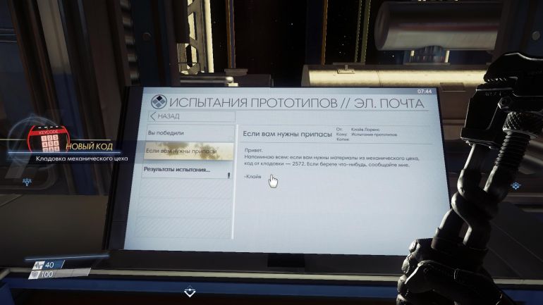 Поднимитесь на гравитационном лифте наверх и осмотрите труп. Пройдите в соседнее помещение с офисами (не по маркёру), где будет компьютер с паролем от кабинета директора. Здесь же есть компьютер с паролем от кладовой (код от самого компьютера написан в валяющейся неподалёку записке, на полу) механического цеха. Идите через проход с гипсом, чтобы найти очередной труп девушки и валяющийся рядом комплект для улучшения оружия.