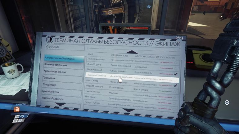 Возвращайтесь обратно и откройте только что найденной ключ-картой проход слева. Убейте фантома и подойдите к нужной двери. Она заперта. Осмотрев помещение, вернитесь назад в застеклённый пункт службы безопасности. Внутри изучите список пассажиров. В аппаратной лаборатории найдите Лоренцо Кальвино и нажмите на F, чтобы начать его отслеживание.