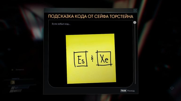Поднявшись на одном таком выше, заберите транскриптор и найдите на одном из столов терминал с тремя письмами (в одном указывается код от кабинета директора). Наверху будет фантом — директор. Убив его, осмотрите сейф слева. Сбоку висит записка с подсказкой Es+Xe. Это два элемента таблицы Менделеева. Их порядковые номера образуют кодовую комбинацию — 9954. Введите и вытащите инъектор, патроны для пистолета и 2 утилизирующие гранаты.