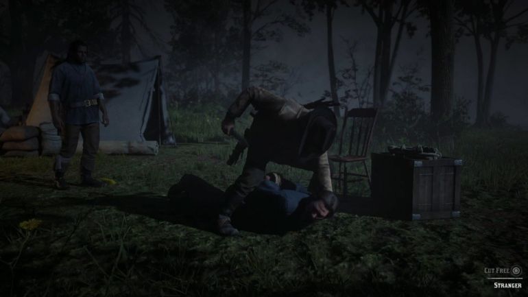 Как только доберетесь до следующего лагеря, опять-таки ничего вокруг не увидите. Чарльз скажет, что это место даже лучше предыдущего. На земле лежит связанный человек. Как только попытаетесь развязать его, то будете атакованы бандитами. Используйте «Меткий глаз» и любое оружие, чтобы остановить их. Вокруг расположено несколько фонарей — стреляйте по ним, чтобы поджигать врагов. Это полезно лишь в том случае, если противник находится рядом с фонарем.
