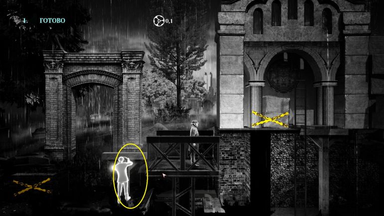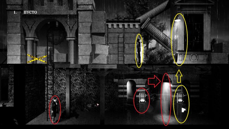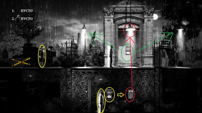 Внутри следующего здания вы провалитесь вниз. Когда создаёте запись действий другого призрака, то можете ходить через освещённые места. Но если эти места в момент проигрывания записи так и останутся освещёнными, то призрак просто остановится и не будет делать то, что вы записывали ранее. Так и здесь. Переключитесь на призрака, пройдите под светом влево и спрыгните вниз. Пройдите направо и отключите правый электрический щиток (выделен жёлтым). Завершите запись. Запустите её. Призрак остановится. Вы должны главным героем отключить левый щиток и держать его до тех пор, пока призрак не пройдёт место под светом верхнего фонаря (он будет отключён). Вот и всё!