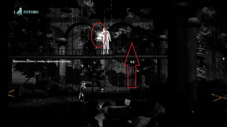 Примечание. Призраком нужно подниматься исключительно по правой лестнице, которая не освещена. Хоть его и не убьёт свет левой лестницы, но запись не будет завершена.