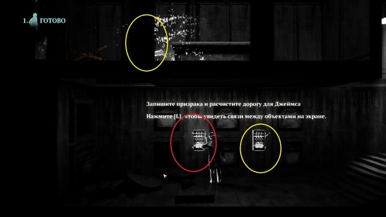 На следующем отрезке вам предстоит познакомиться с управлением другими призраками. Нажмите на клавишу Tab, чтобы переключиться на другого призрака. Когда он будет «мигать», то нажмите на Enter для подтверждения. После этого начнётся запись действий. Затем вы сможете её запустить, при этом управлять главным героем и воспользоваться теми преимуществами и действиями другого призрака, которого вы сейчас запишите. Поднимитесь призраком по лестнице и взаимодействуйте с приборной панелью. Нажмите на Enter, чтобы остановить запись.