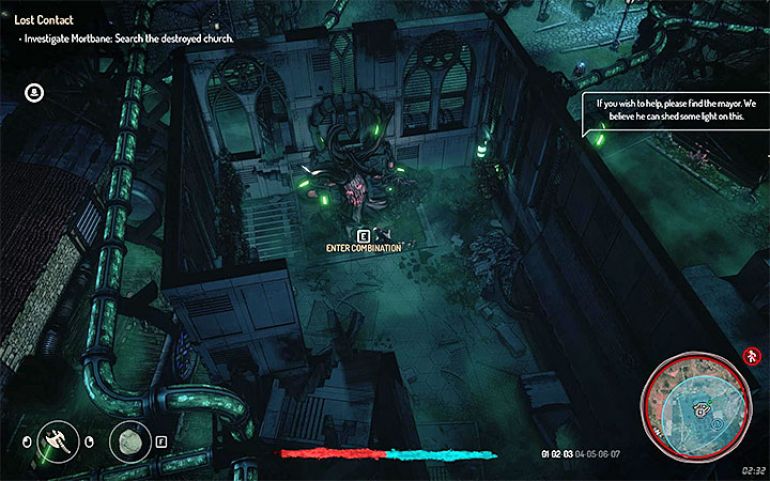 После этого можно немедленно покинуть церковь или собрать еще несколько уникальных предметов. Откройте сейф, представленный на скриншоте (простая мини-игра, в которой нужно угадать пароль), и получите контейнер с нектаром. Кроме того, вы можете отыскать схему шприца для восстановления здоровья и апгрейд второго уровня, расположенные на крыше церкви. Покиньте церковь и поговорите с Артанаком. Так станет доступным следующим сюжетный квест.