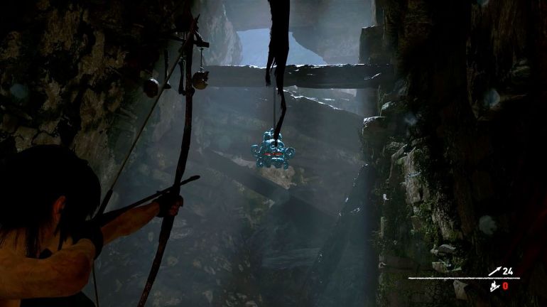 В другом конце руин выстрелите стрелой с веревкой в столбик на другой стороне, чтобы Лара привязала ее к колонне рядом с ней. Переберитесь по веревке на противоположную сторону. Вместо того, чтобы двигаться вперед, спуститесь с выступа и повисните на веревке, чтобы увидеть стену, по которой можно карабкаться. Спуститесь в самый низ, раскачайтесь и прыгайте в скрытую область с тайником и рюкзаком исследователя.