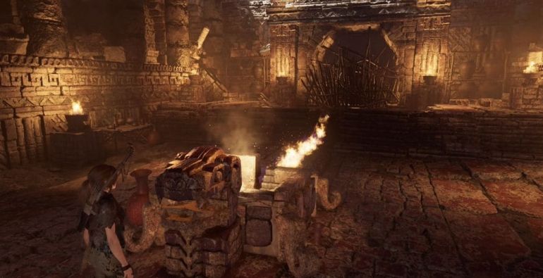Остается потянуть за рычаг каменной конструкции, после чего подняться вниз и спустя несколько секунд активировать рычаг на камине, чтобы поджечь пролитую нефть. Вместо нужного ларца Лара обнаружит некий ключ. Прыгайте в очистные сооружения, о которых рассказывал Эцли.