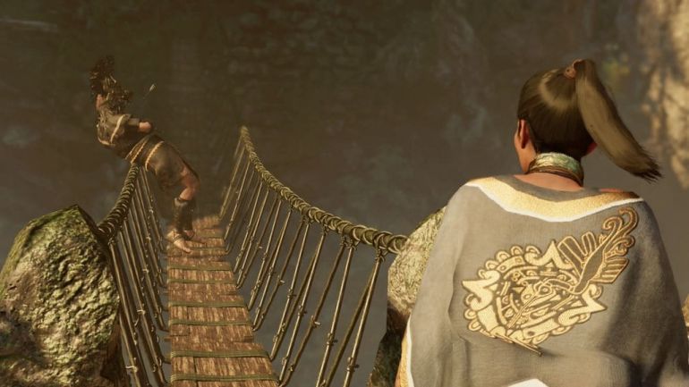 Разрушьте стену, чтобы выбраться из камеры заключения. Следуйте за Унурату и разберитесь с двумя противниками, сбросив одного с уступа. Унурату зачистит мост.