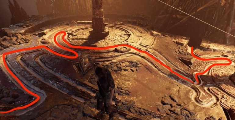 Для начала двигайтесь на правую сторону, где будет рычаг и три змеи с канавой, по которым может течь вода. Вы можете привязывать рычаг к веревкам на опоре этих змей, чтобы вращать по кругу и задавать верное направление. Для начала нужно связать рычаг со змеей на средней высоте, после чего повернуть ее канаву в правую сторону. Бегите к ней поверху и запрыгните наверх, к другой змее. Здесь вы обнаружите доски, которые нужно разбить, чтобы змея могла вращаться. Вернитесь назад и, связывая рычаг, настройте змей так, чтобы две нижних были повернуты влево, а верхняя «смотрела» на Лару. Вода по верхней змее стечет на среднюю, а оттуда — на нижнюю и попадет на колесо. Оно начнет вращаться — первая половина дверей открыта, но вы также сможете пробраться в левую часть пещеры. К слову, по ходу всех этих действий будут появляться волны тех самых монстров, которых вам придется уничтожать.
