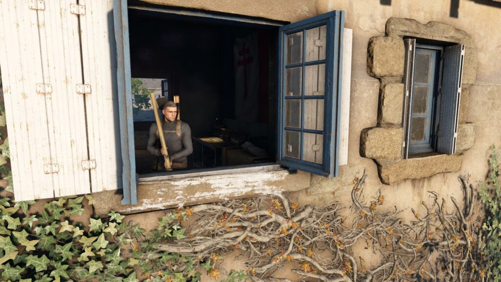 Затем можете безопасно обойти дом перед вами. Рядом с другим домом есть патрульный солдат, и можете подловить его, чтобы ликвидировать скрытно. Продолжайте идти влево, и вскоре обнаружите деревянную сторожевую башню с солдатом наверху. Поднимитесь по лестнице и убейте его, затем пройдите к КПП. Идите вверх по дороге, поскольку теперь вас никто не заметит.