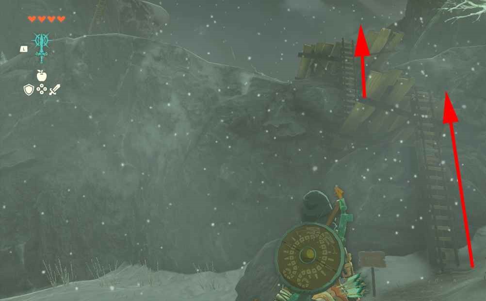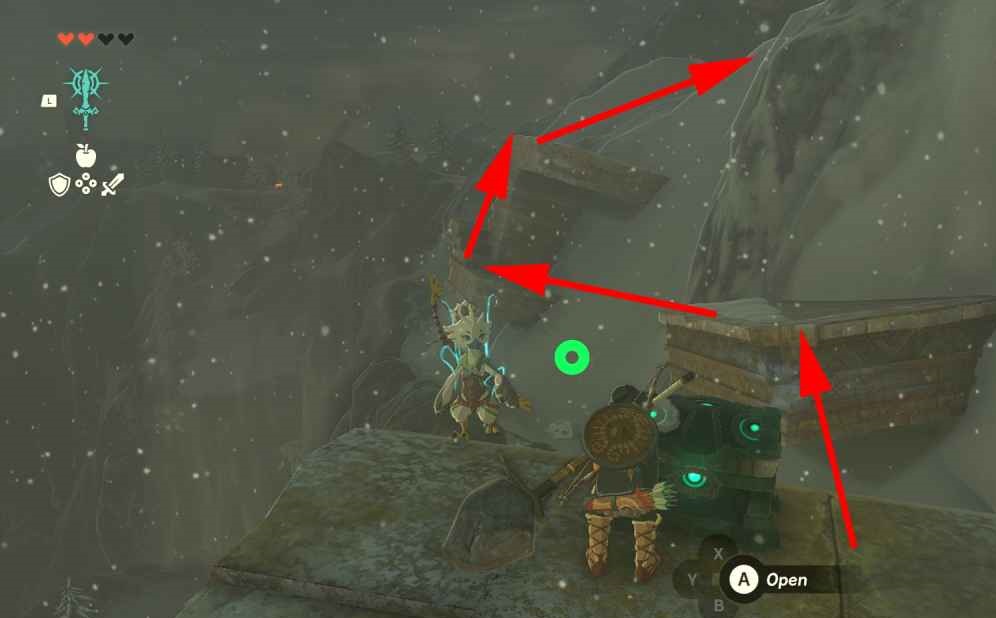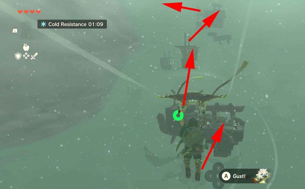 Теперь нужно вернуться туда, где начался квест. К счастью, есть короткий путь! Перед храмом Гутанбака используйте способность «Восхождение» под объектом, напоминающим мертвое дерево. Вы также получите дополнительную добычу: сундук содержит теплые поножи, которые увеличивают сопротивление холоду. За сундуком идите по заснеженной тропе. Достаньте вентилятор из инвентаря и, прикрепите к спине птицы, используя Комбокинез. Если у вас нет вентилятора, можете взять его из раздатчика справа от птиц (используйте Восхождение, чтобы подняться на холм).
