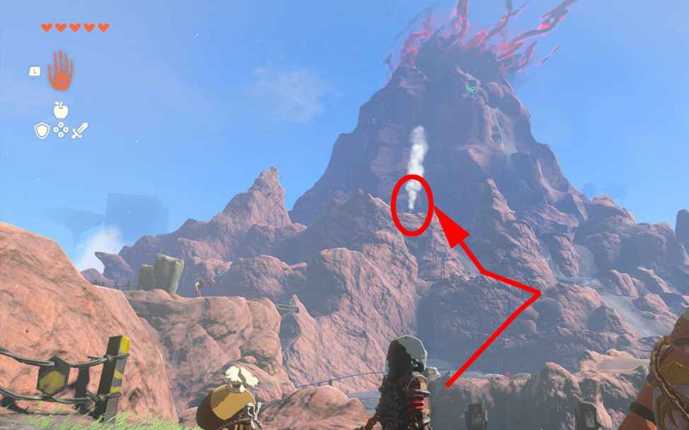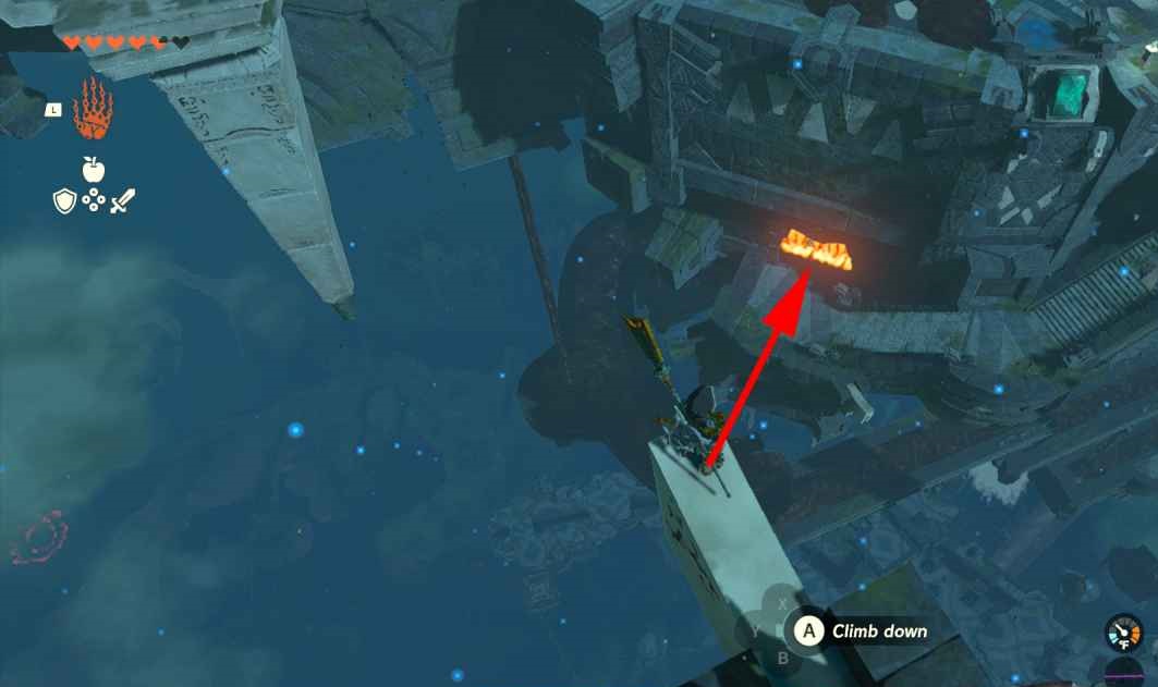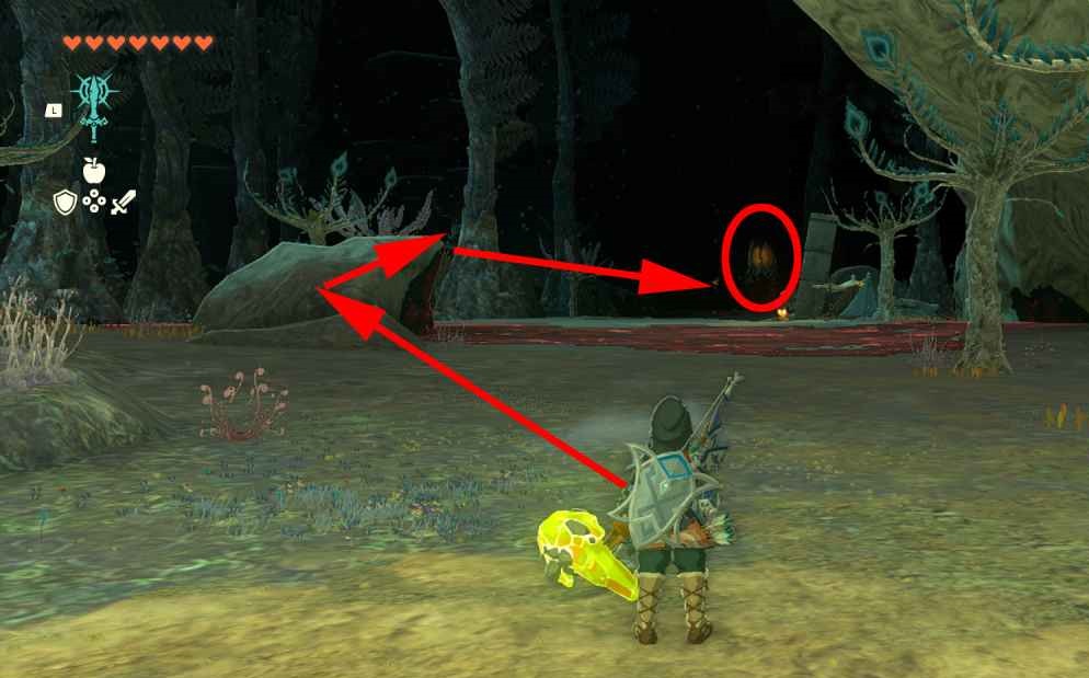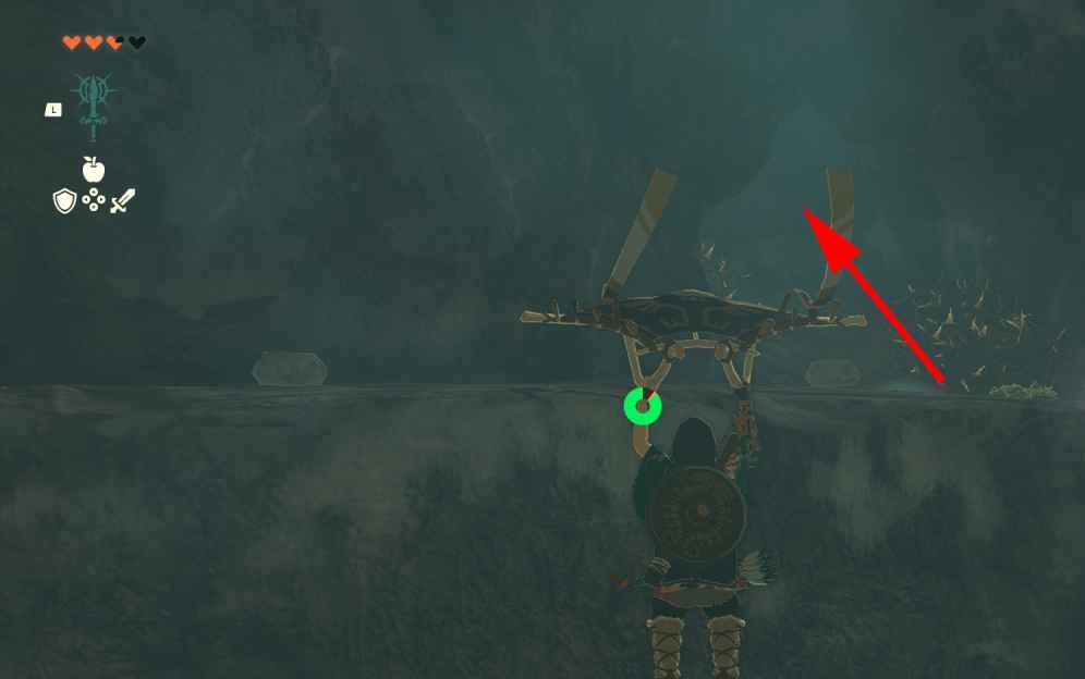 Следуйте по тропе справа от пещеры. Опасайтесь шипов, которые причиняют урон. Когда достигнете большой комнаты с порывом ветра, используйте параплан, чтобы подняться вверх и приземлиться в отверстии в верхней части комнаты. По потолку ходит существо, которое можно сбить стрелами. Или пробегите мимо. В соседней комнате — потухший костер. Разожгите его, бросив кремень и ударив по нему острым оружием, либо выстрелите огненной стрелой. Достаньте из инвентаря сосновую шишку и бросьте в огонь. Создав порыв ветра, используйте параплан и летите вверх.
