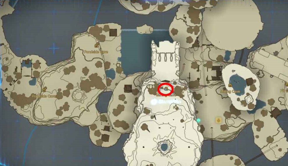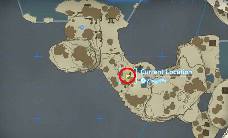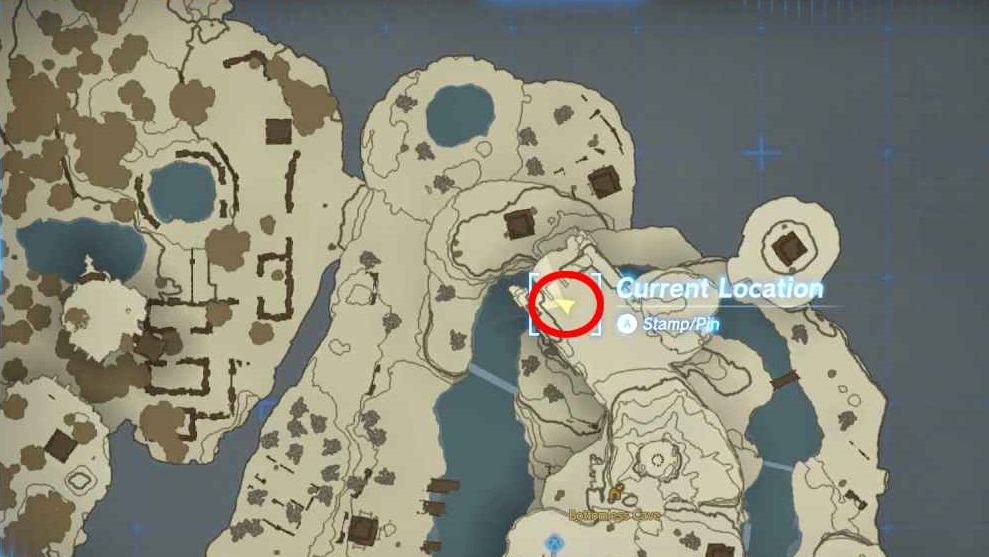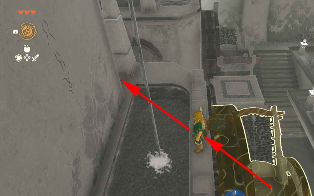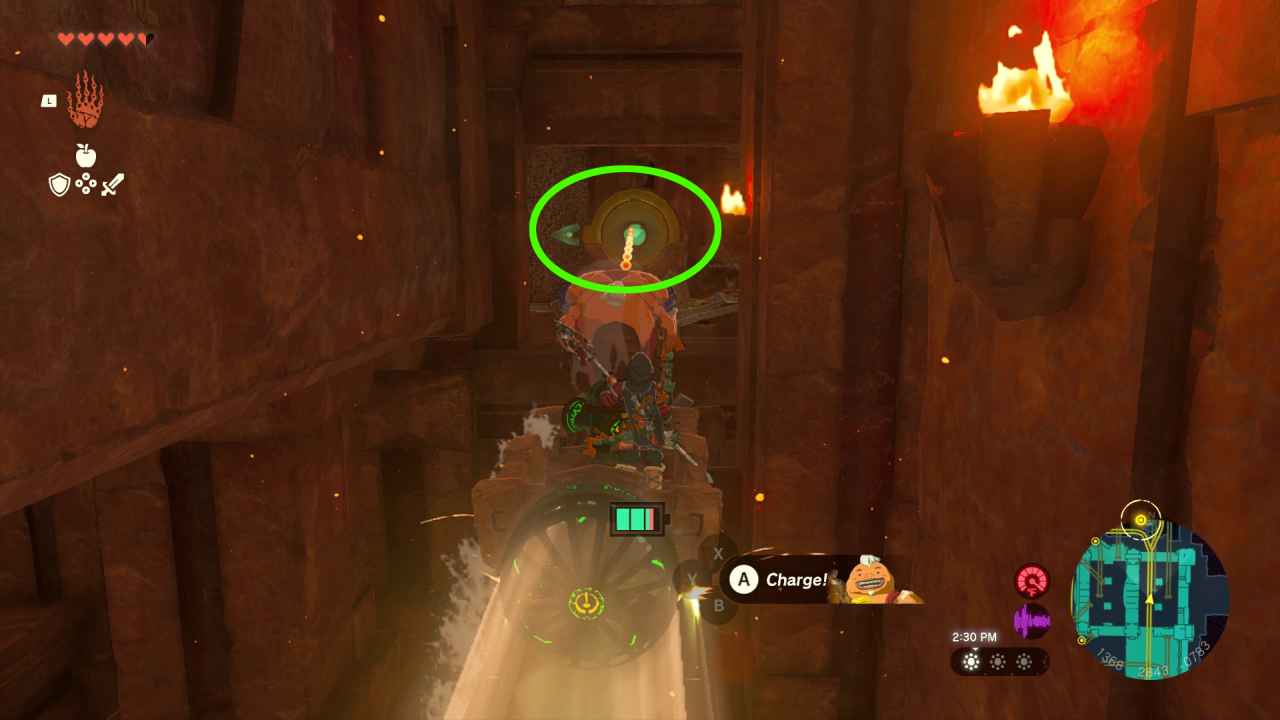 Нажмите на синий маркер быстрого перемещения на юге карты. Это телепортирует вас обратно в стартовую пещеру, в которой Линк очнулся в начале игры. С места появления посмотрите налево, чтобы увидеть на стене два движущихся водяных колеса. Встаньте под левым колесом (тем, что выше) и используйте способность Вознесения, чтобы подняться на колесо. Сразу после приземления используйте возврат, чтобы повернуть колесо, и спрыгните в туннель наверху комнаты, за водяным колесом. Следуйте вглубь, чтобы добраться до храма Начоя.