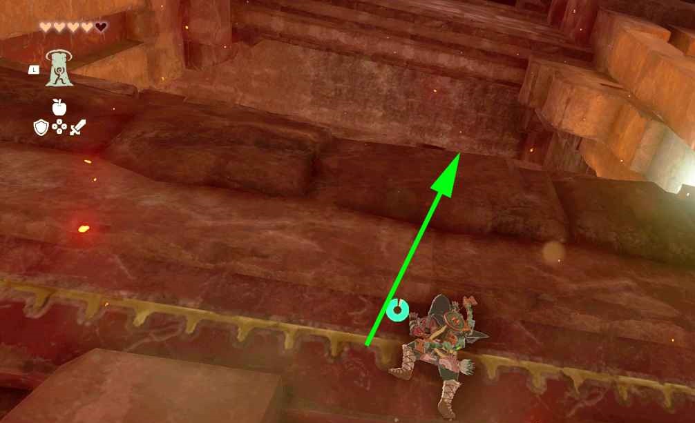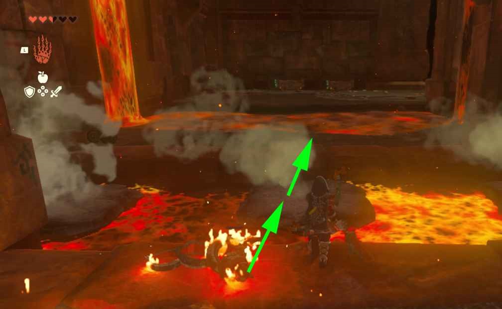В пещере — жарко. Чтобы здесь выжить, нужно экипировать огнестойкое снаряжение, которое продается в магазине доспехов в Гороне или в магазине слева от входа в пещеру. Чтобы выжить, достаточно купить Броню Пламегасителя за 700 рупий. Вам достаточно всего одной части этой брони. Проверьте в инвентаре, что вы ее экипировали. Если вам не хватает рупий, продайте другие вещи. Вы также можете пройтись по окрестностям, поохотиться на животных, уничтожить залежи руды и собрать другие материалы, которые можно продать. В частности, мясо животных в приготовленном виде продается по хорошей цене (например, целиком приготовленная птица продается за 42 рупии, более мелкие части животных в приготовленном виде — за 9-18 рупий, приготовленная рыба — за 7+ рупий в зависимости от типа).